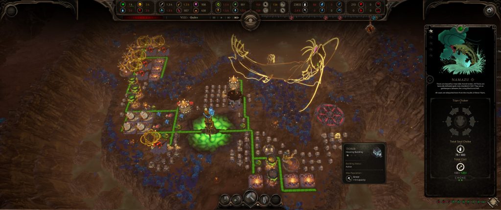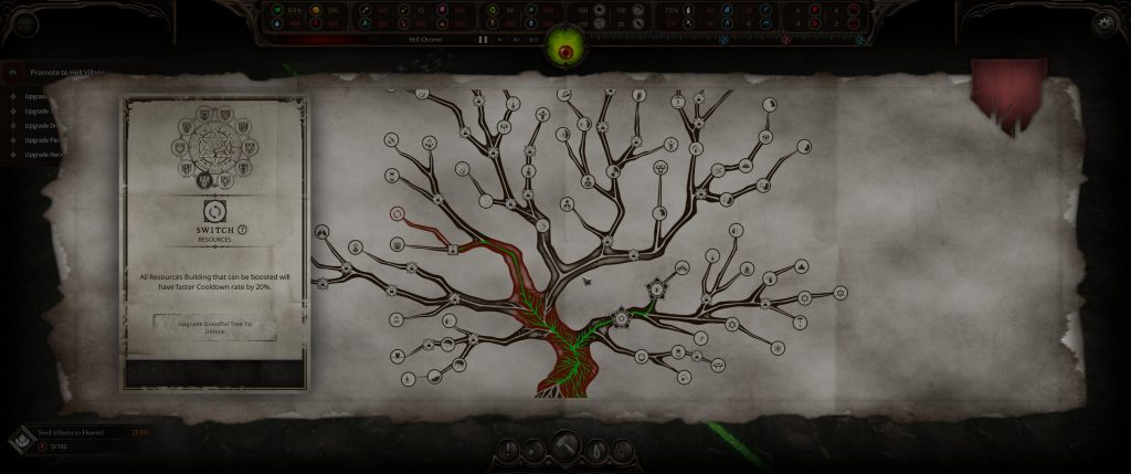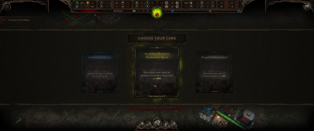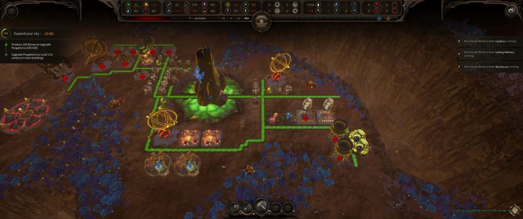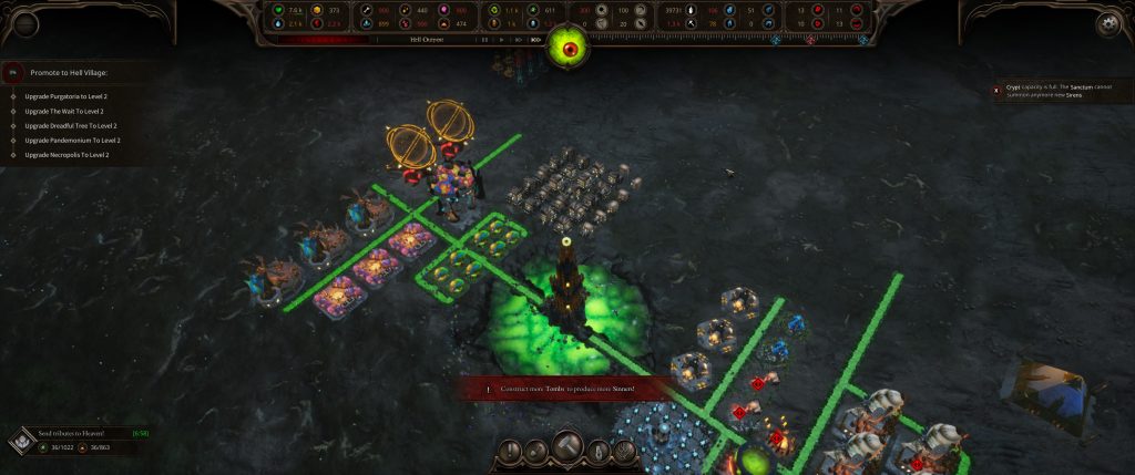 Cet afflux d’âmes signifie qu’il va vous falloir les loger et les occuper en allant produire de très nombreuses ressources : larmes, sang, acide, plein de truc pas dégueu du tout qu’il faudra raffiner pour obtenir d’autres ressources qui serviront non seulement à la construction de vos bâtiments (et leur amélioration) mais aussi et surtout à contenter et maîtriser le démon mais aussi à payer les tributs exigés par le Paradis.