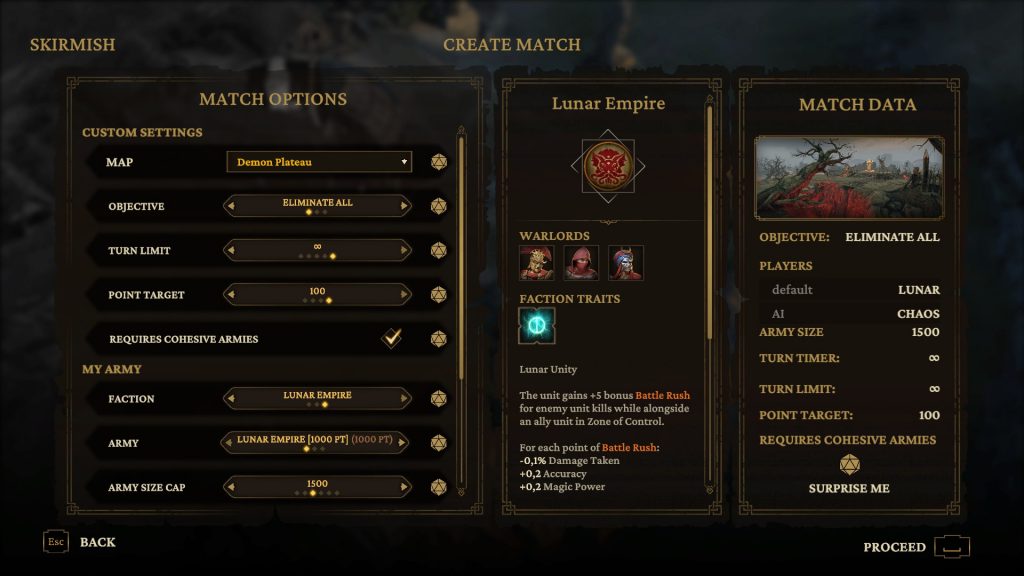 Et si cela vous semble un peu intimidant, le jeu bénéficie d’un tutoriel très bien fait, servant également d’introduction à la campagne et il n’est pas superflu de le rejouer pour bien s’imprégner de toutes les options tactiques disponibles. Et pour vous entrainer vous aurez également la possibilité de créer vos propres batailles avec le mode escarmouche, qui permet de prendre le commandement des trois factions du jeu. Vous pourrez donc jouer de manière tactique les forces du Chaos et celles de l’Empire Lunar afin de repérer leurs atouts et leur faiblesses.