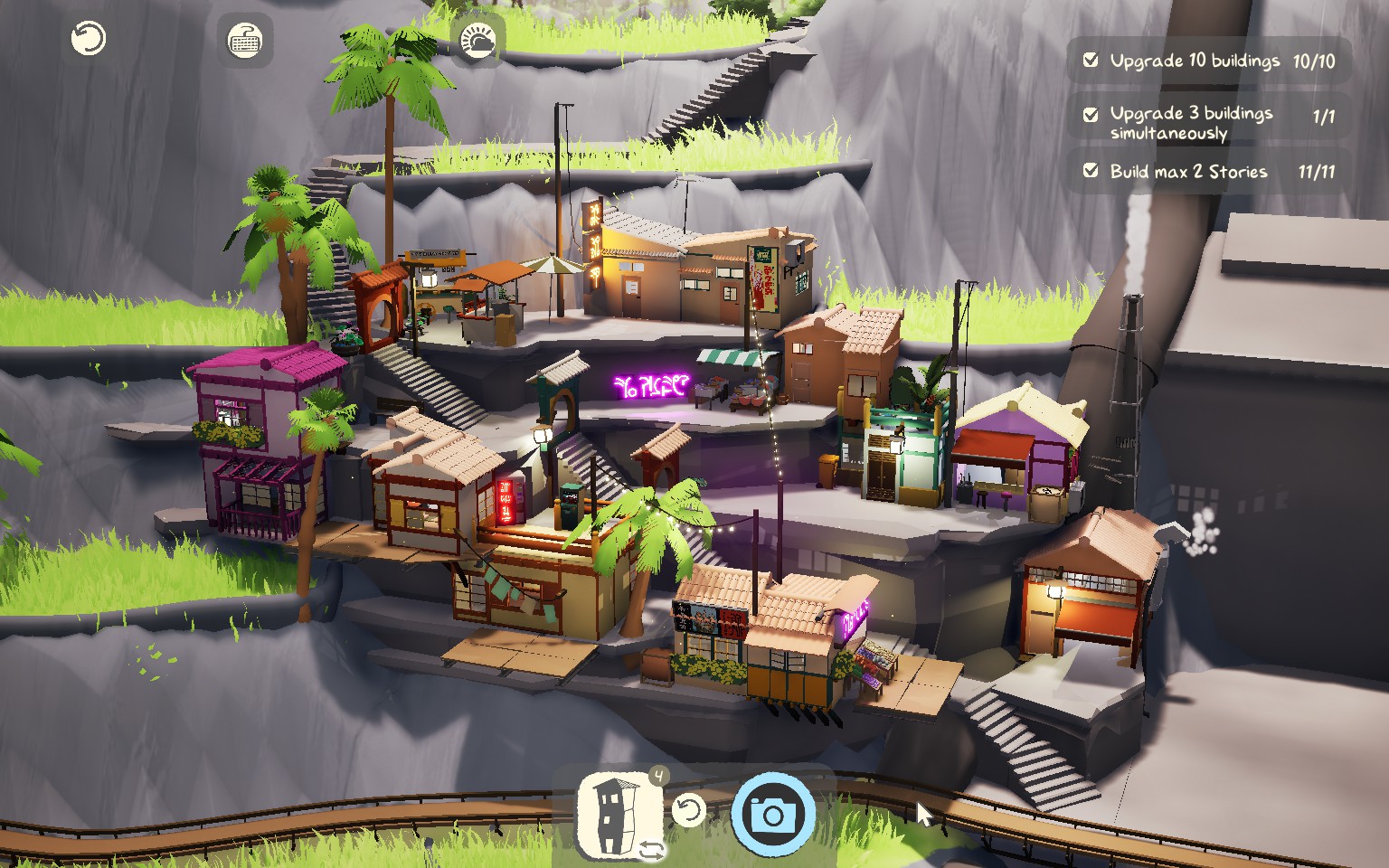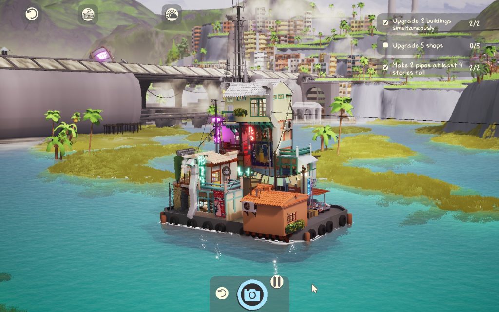On vous propose également une liste d’objectifs, souvent sur le nombre de bâtiments à améliorer ou certaines contraintes physiques. À vous de jongler avec ces facteurs et les pièces à votre disposition afin de compléter le niveau et prendre une jolie photo pour votre dossier. Avec huit zones offrant plusieurs niveaux chacune, ce mode histoire vous occupera déjà un bon moment avant de vous laisser libre cours à votre créativité en mode bac à sable.