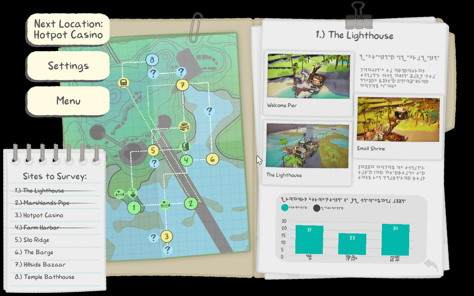 Dans ce mode, ShantyTown vous propose différentes petites cartes pour aller y construire vos mini-bidonvilles. Le menu se présente comme une carte et différents dossiers d’arpenteur de terrain correspondant à chaque zone. Si la surface de construction change à chaque niveau, le principe est toujours le même : vous disposez d’un nombre fixe d’éléments, qui se débloquent au fur et à mesure que vous placez ceux dans votre main, et que vous devez arranger sur l’espace restreint à votre disposition.