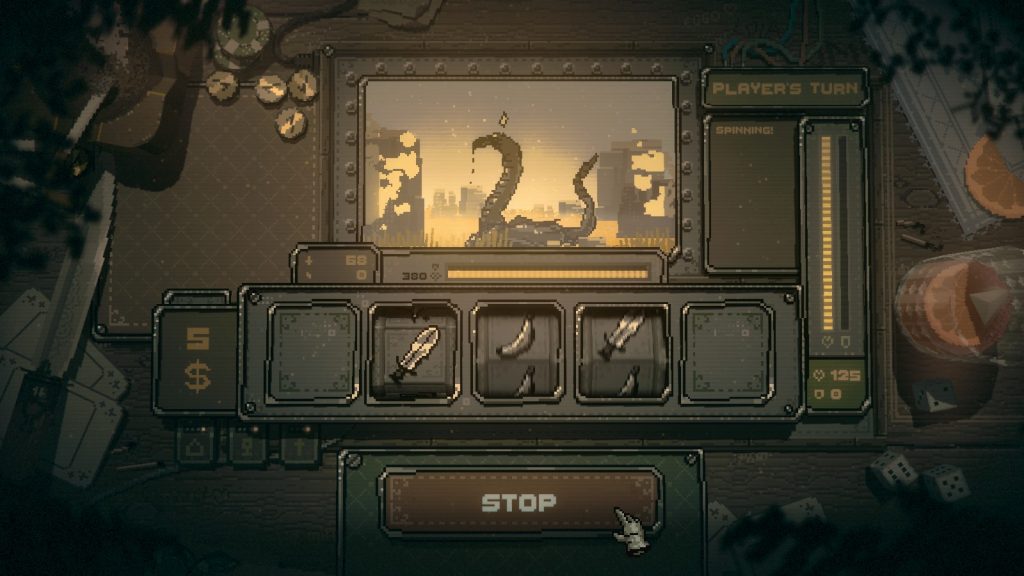 Vous constituez une collection de symboles qui regroupent vos armes, vos protections et votre loot, et ces symboles vont venir prendre place sur les roues de votre machine à sous. Une fois le combat engagé, il ne vous reste plus qu’à pousser le bouton et laisser le hasard décider pour vous. C’est donc une combinaison de vos choix et de pas mal de chance qui vont définir l’issue des combats. Au passage, vous collectez à la fois quelques piécettes qui vont vous permettre d’améliorer votre sélection (et donc d’augmenter vos chances) entre chaque combat, mais aussi des jetons de poker qui vous permettront d’améliorer vos futur runs.