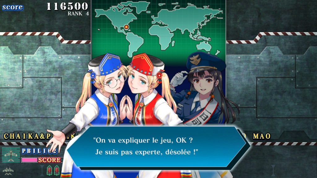 Oui, comme tout bon shoot’em up, le scénario n’a strictement aucun intérêt et ce ne sont pas les interventions ineptes des personnages à chaque fin de niveau qui changeront la donne. Pour vous donner une idée, on est dans les eaux d’un Street Fighter 2.
