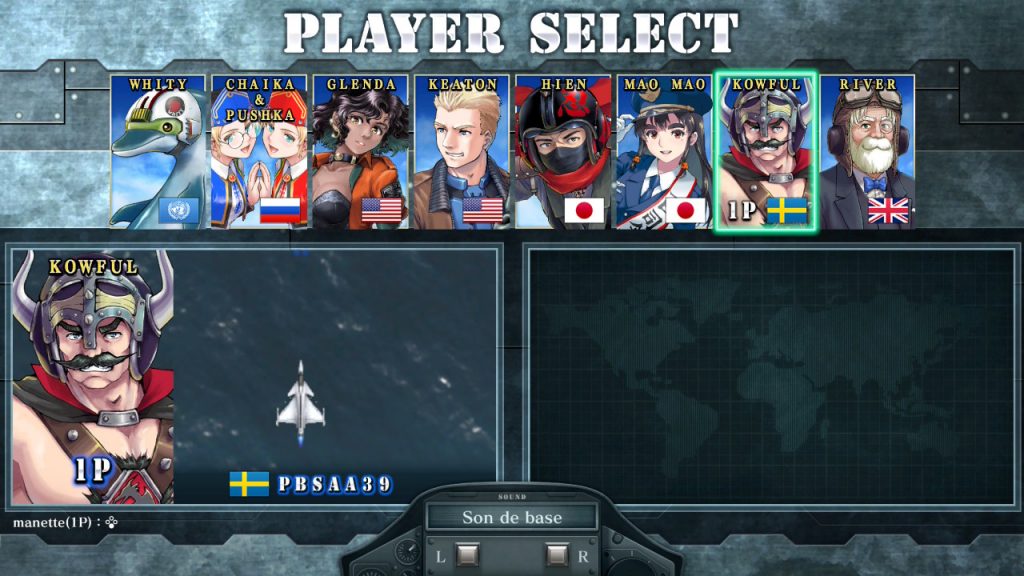 En effet, vous aurez accès à pas moins de 9 personnages de différentes nationalités avant de pouvoir débloquer d’autres pilotes secrets. N’insistez pas, je n’en dirai pas plus (puisque, justement je n’ai pas réussi à les débloquer). Du côté des avions, ce n’est pas moins de 8 engins différents qui s’offrent à vous (là encore, avant de débloquer les avions secrets. Ah quel mystère !). Bien évidemment, chaque avion dispose d’un tir spécifique et de bombes à l’effet, là aussi, variable.