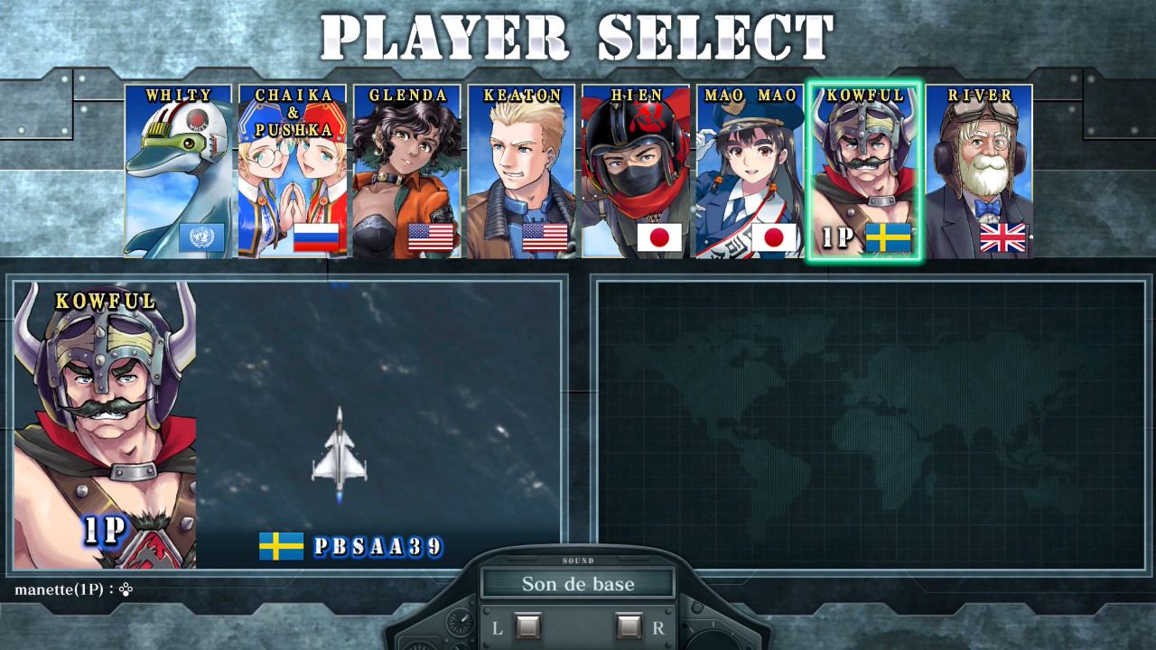 En effet, vous aurez accès à pas moins de 9 personnages de différentes nationalités avant de pouvoir débloquer d’autres pilotes secrets. N’insistez pas, je n’en dirai pas plus (puisque, justement je n’ai pas réussi à les débloquer). Du côté des avions, ce n’est pas moins de 8 engins différents qui s’offrent à vous (là encore, avant de débloquer les avions secrets. Ah quel mystère !). Bien évidemment, chaque avion dispose d’un tir spécifique et de bombes à l’effet, là aussi, variable.