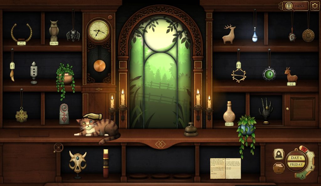 Très rapidement viennent s’ajouter, à la panoplie d’outils à votre disposition, plusieurs cartes. Du village, d’abord, puis d’un château et des catacombes. Chacune d’entre elles vous permet d’aller explorer les alentours, principalement pour y découvrir de nouveaux bibelots à ajouter à vos étagères. Pour cela, il va falloir résoudre de petites énigmes, qui vous arrivent chaque jour, sous forme de lettres, notes mystérieuses et autres cartes de tarot. Bref, à nouveau, il va simplement falloir un peu faire travailler vos cellules grises.
