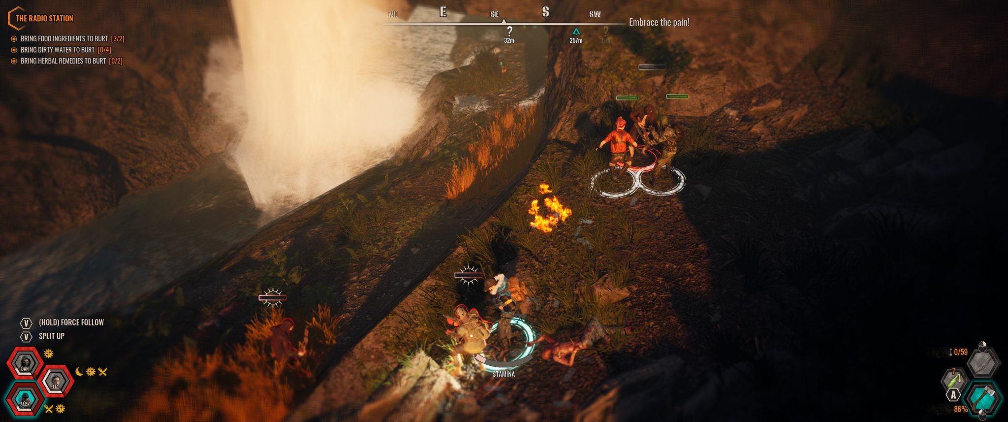 J’ai parlé de rencontres et si celles qui restent amicales permettent de faire avancer l’histoire et les quêtes secondaires, celles menant au conflit permettent de jouer avec le mode tactique qui est… un vrai fiasco. En effet, et malgré ce à quoi on aurait pu s’attendre – mais à ce moment-là plasm@n et faxo m’auraient sauté dessus pour avoir le jeu – Survive the Fall n’est pas au tour par tour mais en temps réel. La seule tactique que l’on choisit c’est de savoir si nos poulets décapités de compagnons vont courir au-devant du danger ou s’ils vont rester en arrière.