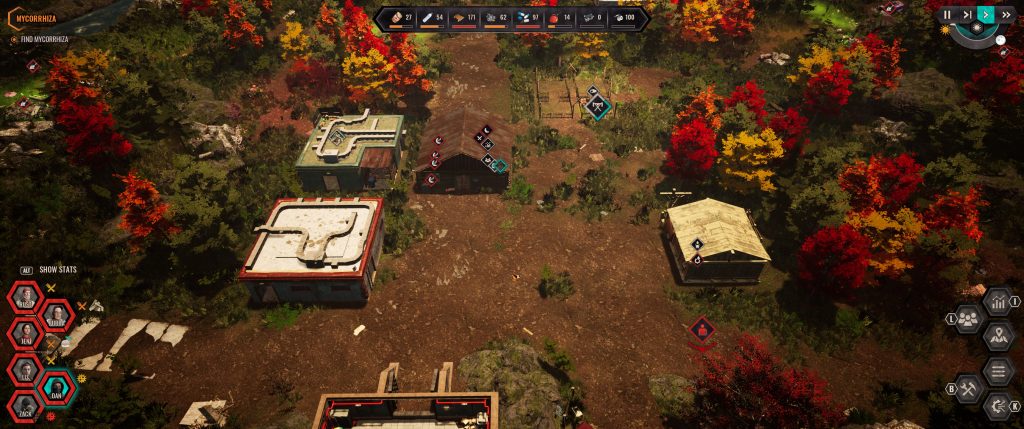 C’est pratique et ça permet de planifier ses sorties qui, contrairement à celles de This War of Mine par exemple, tournent bien souvent très bien, grâce à un monde très généreux et littéralement des centaines de choses à ramasser. A ce propos, on peut donner à chacun de ses personnages des ordres pour aller fouiller et ramasser des ressources, ce qui permet de couvrir plus de terrain mais qui oblige à un nombre fastidieux de manipulations. Et avant que vous ne demandiez, non le ramassage n’est pas immédiat, il y a un petit temps d’attente. Ce qui veut dire que l’on perd du temps à chaque fois que l’on collecte quelque chose…