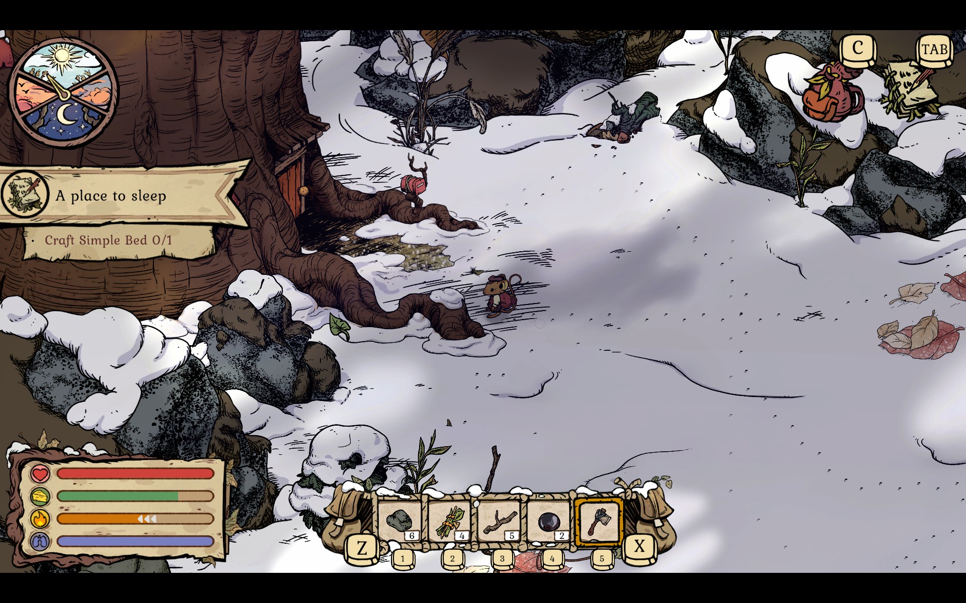 Winter Burrow, à son cœur, est un jeu de survie. Bon, on n’est pas sur du Don’t Starve au niveau de la difficulté, rappelez-vous, c’est de la survie cosy. Mais comme dans celui-ci, vous allez devoir collecter différents matériaux tout en survivant au froid et à la faune hostile de ces bois. Avec les matériaux collectés, vous pourrez non seulement vous bricoler de l’équipement, vous tricoter des habits chauds, mais aussi bien entendu, réparer le fameux terrier.