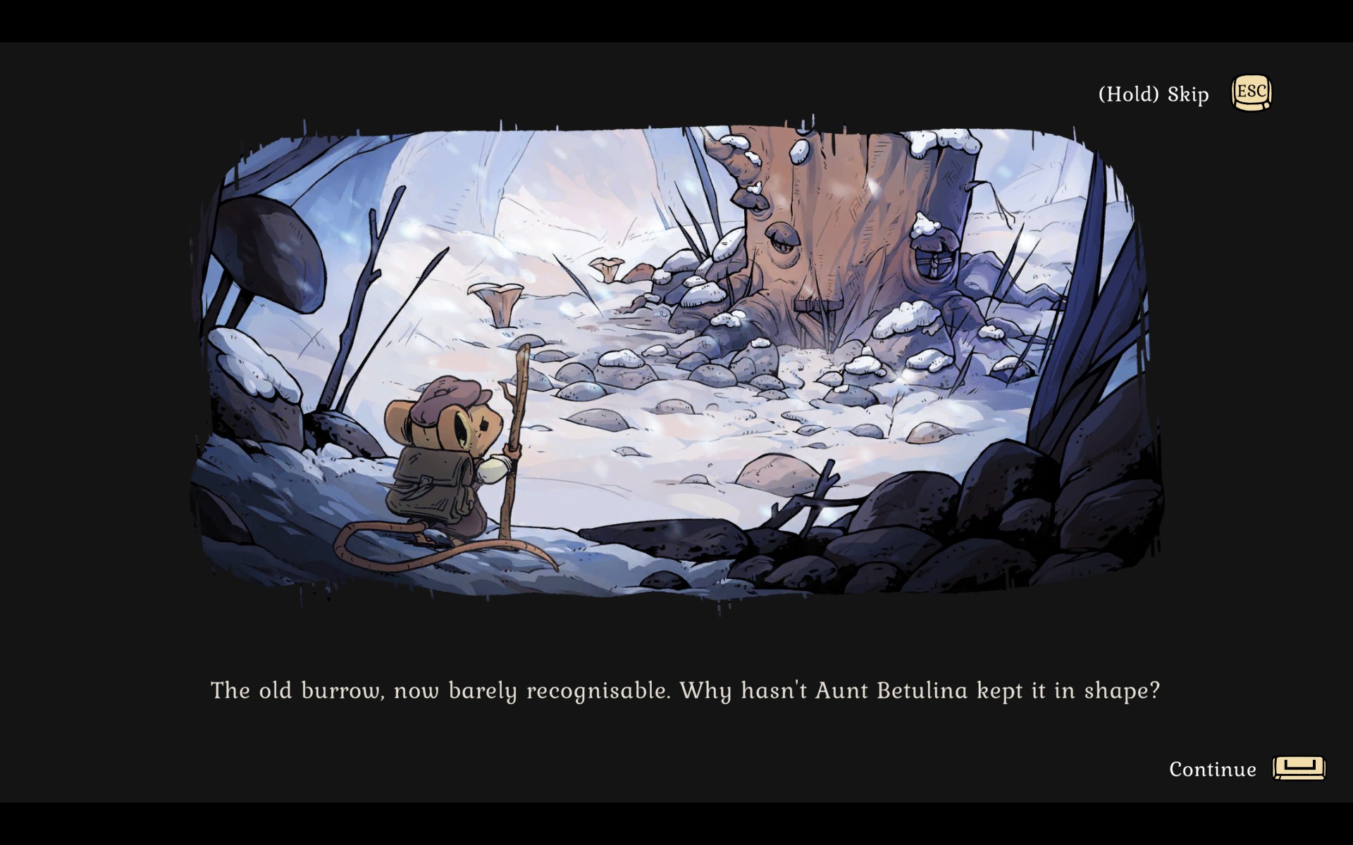 Bon, commençons par ce que j’ai aimé, car globalement, j’ai apprécié le jeu. Déjà, visuellement, le jeu est une pépite. Il vous donne l’impression de jouer à l’intérieur d’un livre pour enfant (certains thèmes de l’histoire sont un peu dramatiques cependant, donc ses visuels n’en font pas un jeu enfantin pour autant). Winter Burrow est globalement relaxant et feel good, malgré quelques petits points dont je vais vous reparler, ce qui pour moi rempli le contrat du jeu de survie cosy.