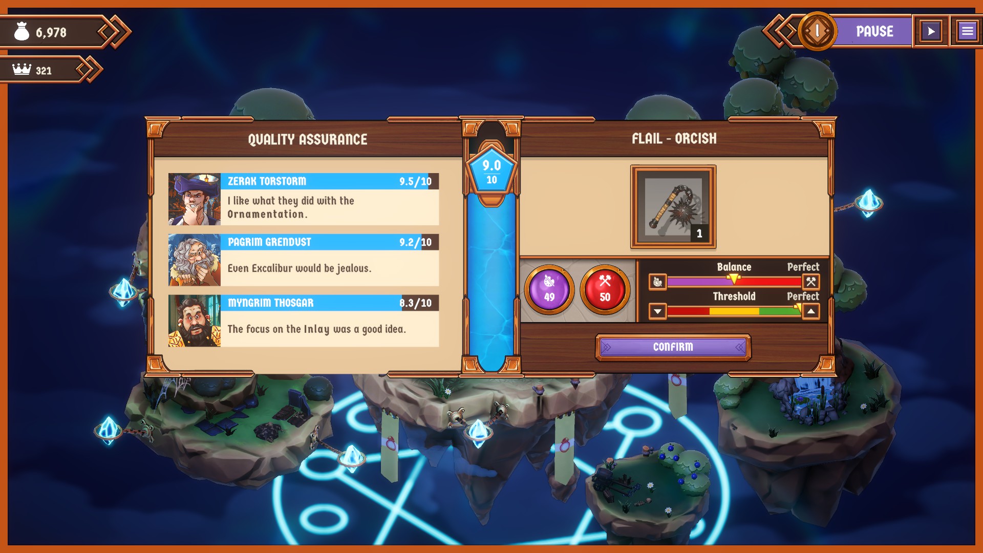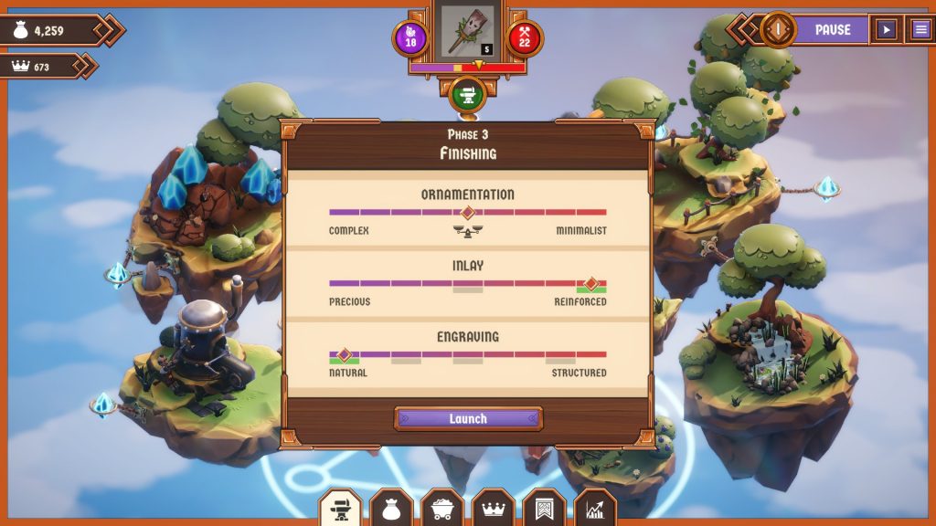 Si le postulat de départ est alléchant, le choix de gameplay est plus sujet à interrogation : pour forger une arme, vous allez devoir trouver la bonne formule. Il y a trois étapes pour lesquelles vous allez déterminer à chaque fois le niveau dans trois critères. Plus vous tombez juste, plus l’arme est de qualité et se revendra cher. Sans compter bien entendu que certains contrats exigent un certain niveau de qualité.