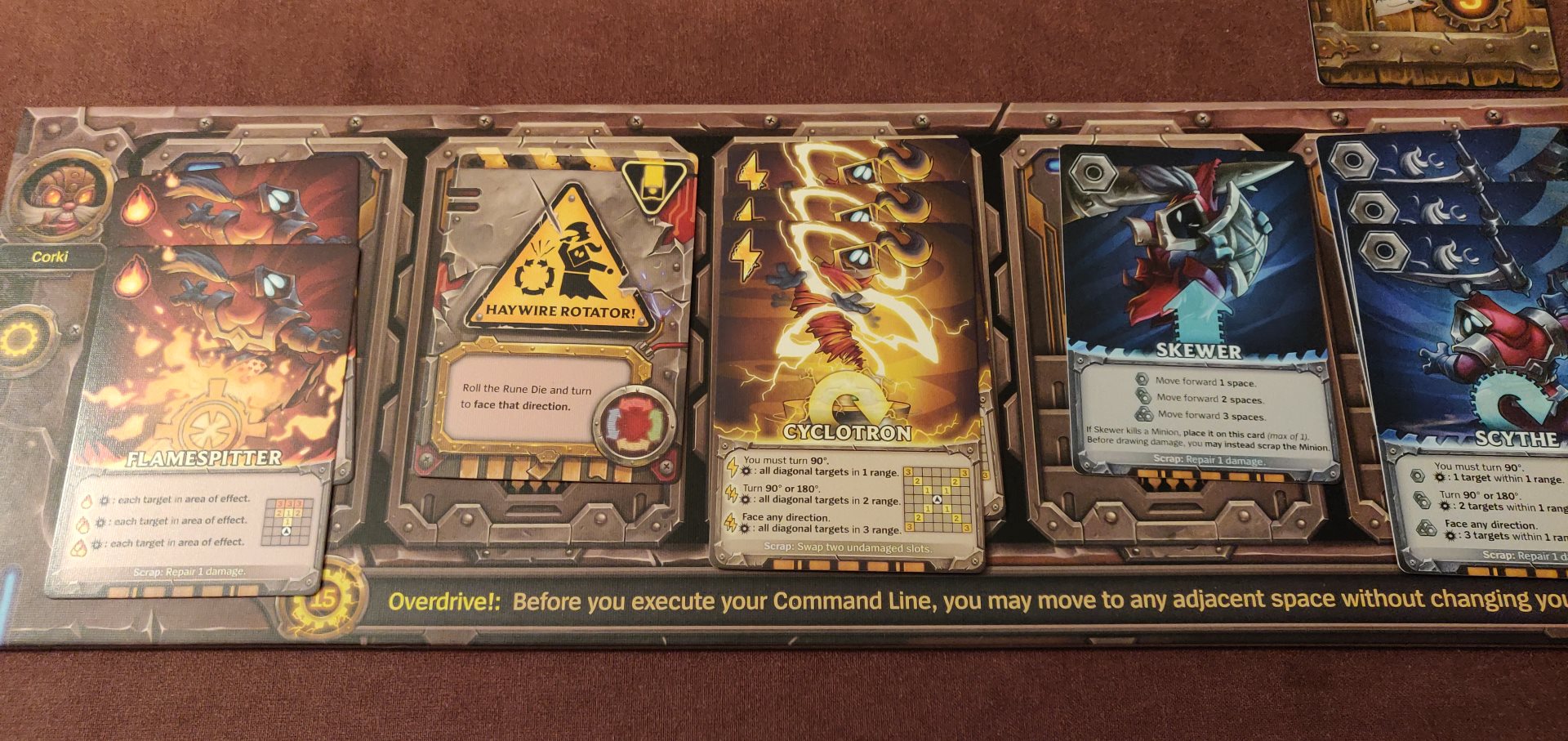 Sauf qu’au bout d’un ou deux tours, vous vous retrouvez à faire n’importe quoi : votre Mech court à l’opposé des Minions, il tire dans le vide et s’oriente pile dans la direction où il n’y a personne. Cela vous rend inefficace et surtout vous laisse à portée des Minions qui vous infligent des dégâts. Ceux-ci sont variés et assez fendards : inversion de deux cartes dans la séquence d’ordres, demi-tour intempestif… les concepteurs se sont fait plaisir. Pour remédier à cela, il est heureusement possible de défausser des cartes au moment de la draft pour soit effectuer une réparation, soit inverser deux commandes. Chaque fin de tour est donc un moment de profonde réflexion, où chacun essaie de visualiser ce que son Mech va faire et tente de corriger tout ça pour le rendre plus efficace.