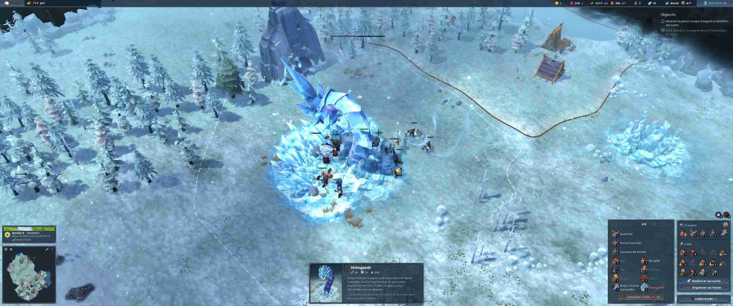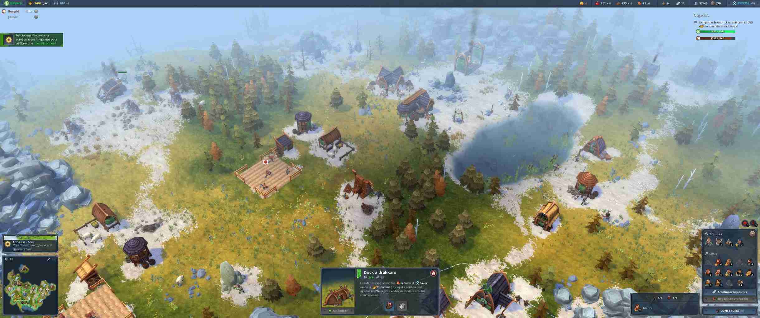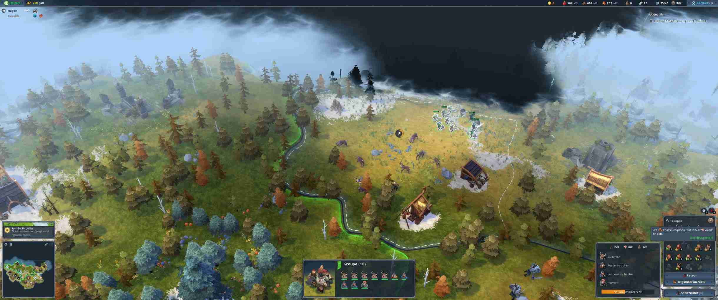 Si vous démarrez chaque carte de manière classique avec un hôtel de ville et quelques paysans en plus de votre héros, les mécaniques de jeu vous emportent très vite loin des STR habituels, Age of Empires en tête. Ici, chaque carte est divisée en zones qu’il va vous falloir annexer, en payant un tribut en argent ou en nourriture. Il pourrait être tentant de rester dans son coin, histoire de se renforcer avant d’explorer mais ici, point de salut pour les tortues : chaque zone ne peut accueillir qu’un nombre très limité de bâtiments. Et bien souvent, elles disposent d’un ou deux types de ressources au maximum. Vous voulez pêcher pour nourrir vos troupes ? Annexez une zone disposant d’un étang. Il vous faut de la pierre ? C’est dans une autre zone mon p’tit monsieur. Northgard demande donc de s’étendre méthodiquement car annexer coûte de plus en plus cher. Et les zones sont souvent défendues par les autres tribus ou des monstres mythologiques et autres loups. Déterminer les besoins immédiats est donc indispensable, chaque peuple jouable disposant en plus de forces et faiblesses variées (ainsi que de bâtiments spécifiques). Il y a donc une gestion au niveau militaire (les armées ne sont jamais bien grandes dans Northgard, tout au plus une quinzaine de guerriers) et au niveau économique car, surcouche de gestion oblige, il faut prendre en compte les hivers rigoureux. Oui, dans un STR les développeurs vous demandent de gérer vos stocks de bois et de nourriture (qui est consommée en continu) pour que vos ouailles ne passent pas l’arme à gauche au moindre coup de froid. Comme dans Banished (en plus simple quand même), vous allez donc devoir équilibrer les stocks et la production. C’est une particularité très bien pensée qui permet de jouer sur différents niveaux et de satisfaire ceux pour qui faire un lasso autour de troupes pour les envoyer à la mort n’est pas suffisant.