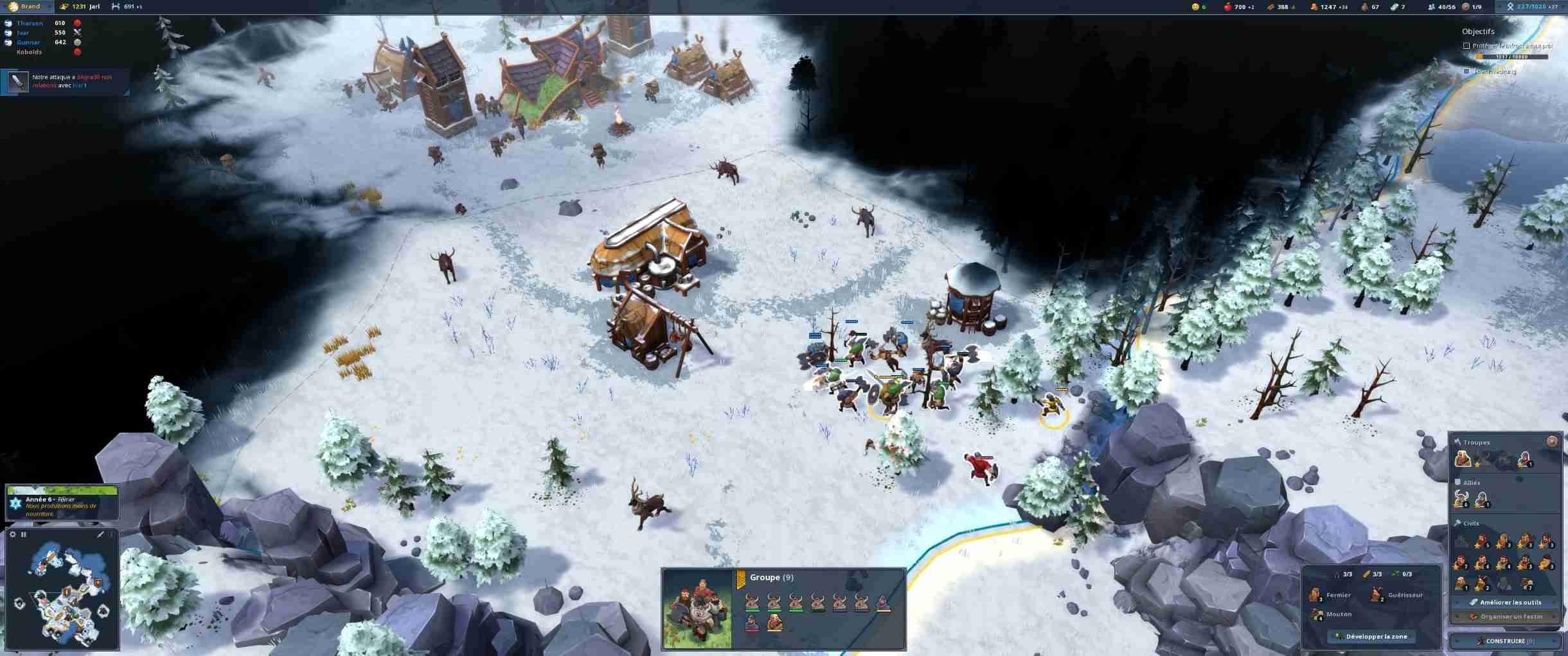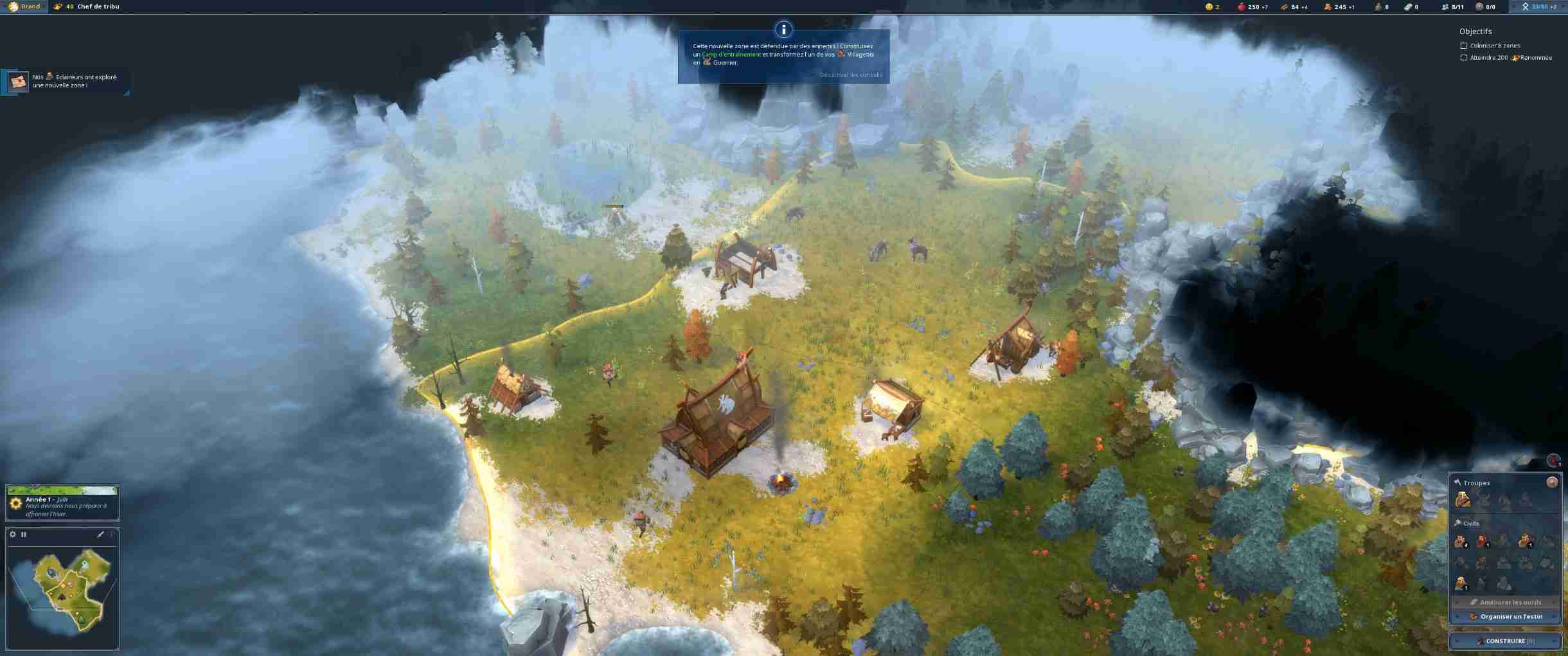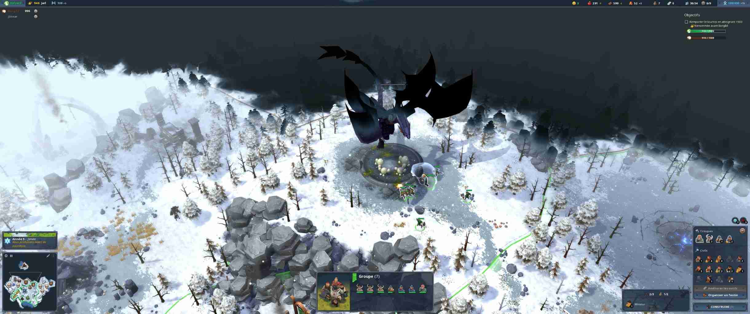 Si vous démarrez chaque carte de manière classique avec un hôtel de ville et quelques paysans en plus de votre héros, les mécaniques de jeu vous emportent très vite loin des STR habituels, Age of Empires en tête. Ici, chaque carte est divisée en zones qu’il va vous falloir annexer, en payant un tribut en argent ou en nourriture. Il pourrait être tentant de rester dans son coin, histoire de se renforcer avant d’explorer mais ici, point de salut pour les tortues : chaque zone ne peut accueillir qu’un nombre très limité de bâtiments. Et bien souvent, elles disposent d’un ou deux types de ressources au maximum. Vous voulez pêcher pour nourrir vos troupes ? Annexez une zone disposant d’un étang. Il vous faut de la pierre ? C’est dans une autre zone mon p’tit monsieur. Northgard demande donc de s’étendre méthodiquement car annexer coûte de plus en plus cher. Et les zones sont souvent défendues par les autres tribus ou des monstres mythologiques et autres loups. Déterminer les besoins immédiats est donc indispensable, chaque peuple jouable disposant en plus de forces et faiblesses variées (ainsi que de bâtiments spécifiques). Il y a donc une gestion au niveau militaire (les armées ne sont jamais bien grandes dans Northgard, tout au plus une quinzaine de guerriers) et au niveau économique car, surcouche de gestion oblige, il faut prendre en compte les hivers rigoureux. Oui, dans un STR les développeurs vous demandent de gérer vos stocks de bois et de nourriture (qui est consommée en continu) pour que vos ouailles ne passent pas l’arme à gauche au moindre coup de froid. Comme dans Banished (en plus simple quand même), vous allez donc devoir équilibrer les stocks et la production. C’est une particularité très bien pensée qui permet de jouer sur différents niveaux et de satisfaire ceux pour qui faire un lasso autour de troupes pour les envoyer à la mort n’est pas suffisant.