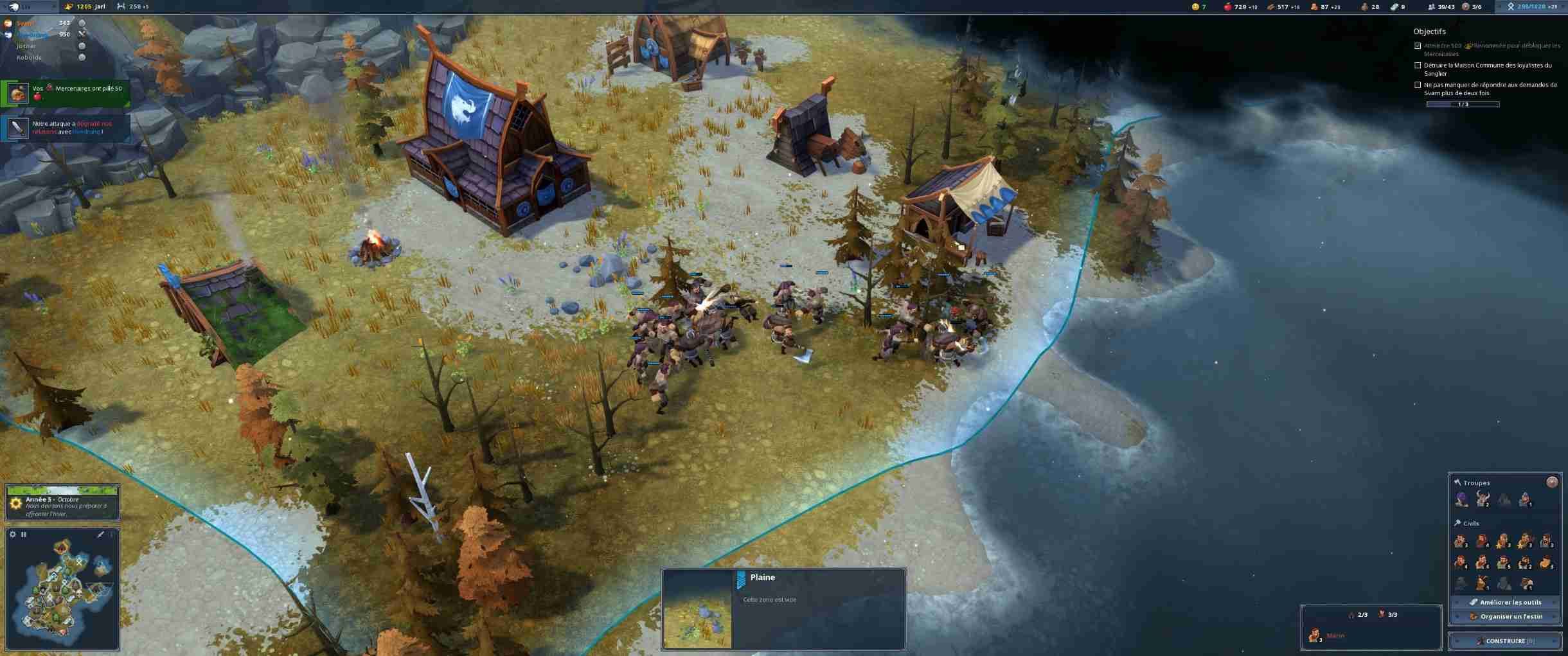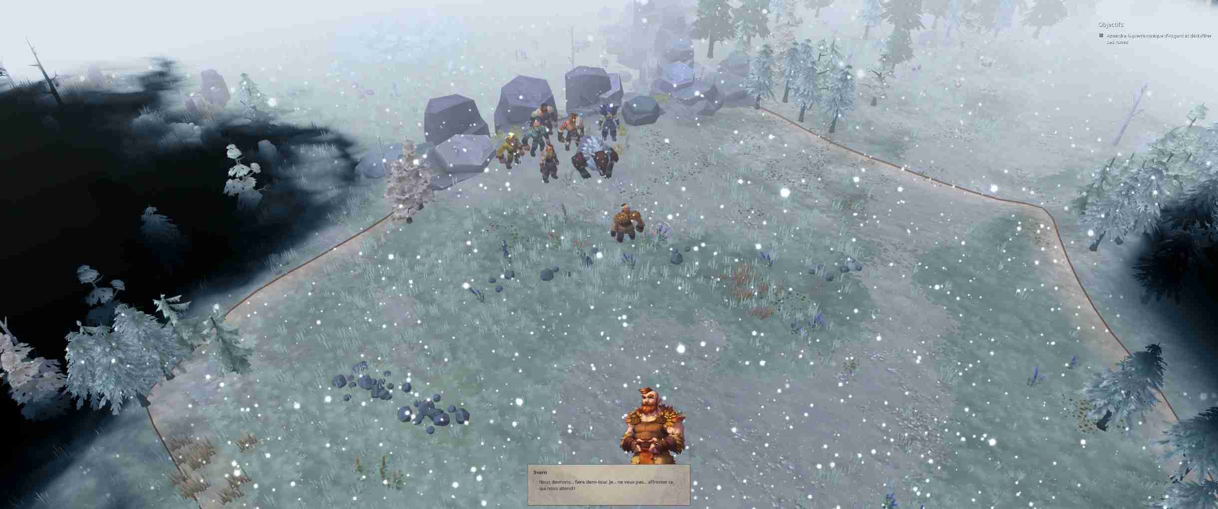 Lors de votre expansion vous découvrirez aussi d’autres peuples avec lesquels vous pourrez commercer pour vous enrichir, des ruines qui vous apporteront de la renommée ou des trésors une fois explorées et diverses choses dont je ne peux vous parler sans gâcher le plaisir de la découverte. La conquête est donc indispensable car elle augmente en plus le bonheur de vos citoyens, qui arriveront plus vite si ce dernier est élevé. Oui, encore une particularité du jeu : vous ne créez pas manuellement des paysans, ils arrivent à intervalles réguliers. Vous ne créez pas non plus vos guerriers/éclaireurs/pêcheurs : vous envoyez un paysan dans le bâtiment adéquat pour qu’il y subisse un entraînement. Si cela peut sembler fastidieux au premier abord, cela offre en fait une souplesse de développement inégalée. Vous venez de conquérir une zone riche en mines ? Convertissez plusieurs paysans en mineurs et une fois les ressources épuisées, retransformez-les en ce que vous voulez selon la situation. Cela évite d’avoir des guerriers qui se tournent les pouces pendant que tout le monde crève de faim faute de main d’œuvre.Vous l’aurez compris, la partie gestion de Northgard regorge de petites trouvailles bienvenues et rafraîchissantes. La partie militaire, quant à elle, est bien plus classique : vous envoyez vos troupes attaquer une zone, les micro-managez pour que vos porteurs de boucliers encaissent les coups pendant que vos unités à distance bourrinent de loin et… c’est à peu près tout. Une fois la zone vidée de ses occupants, vous l’annexez et passez à la suivante. Pas de grosse stratégie à mettre en œuvre, les gars de Shiro Games sont restés simples et efficaces.Une des choses qui m’ont bien plu pendant la campagne solo est que les objectifs diffèrent vraiment d’une mission à l’autre. On sort très vite du sempiternel « videz la carte » pour attaquer des choses plus intéressantes comme atteindre un seuil de renommée avant une faction adverse. Cela renouvelle constamment l’intérêt et même si certaines missions peuvent sembler longuettes, le plaisir de jeu reste intact.