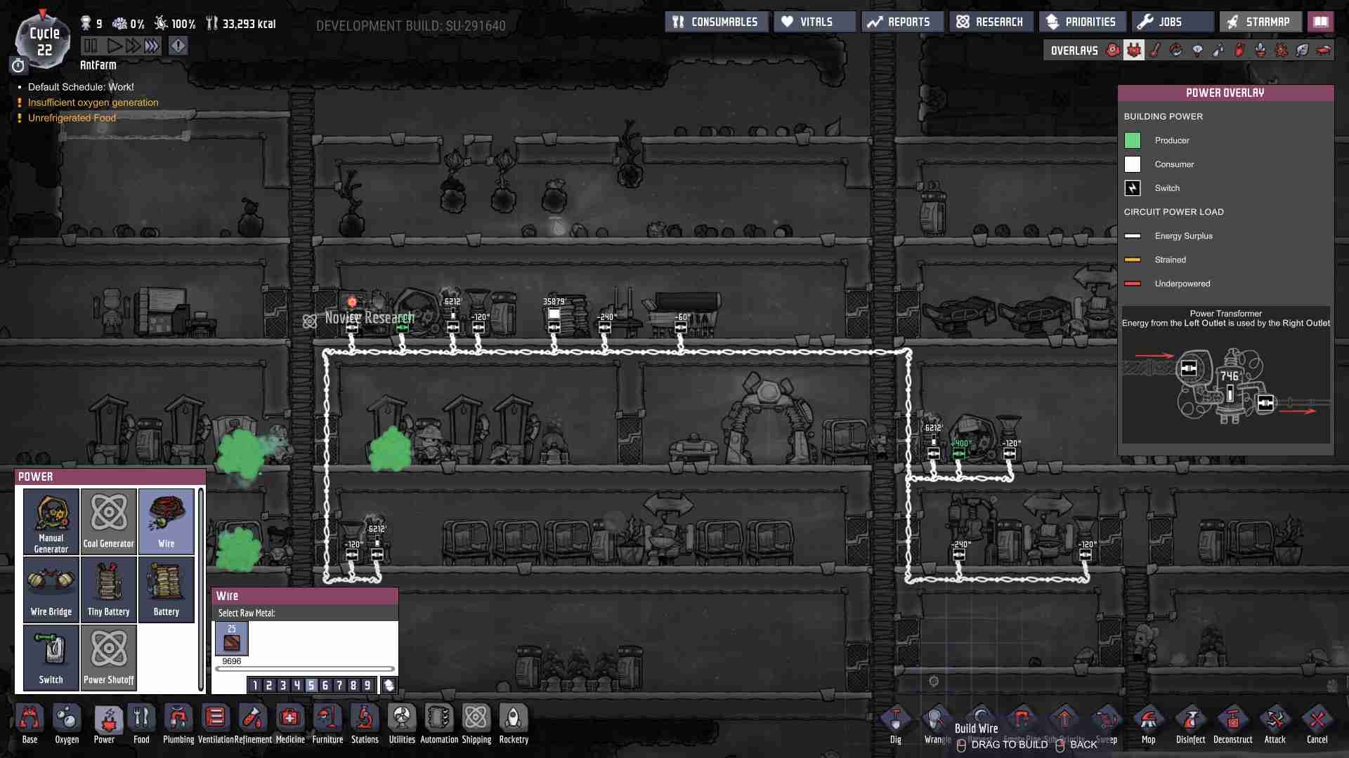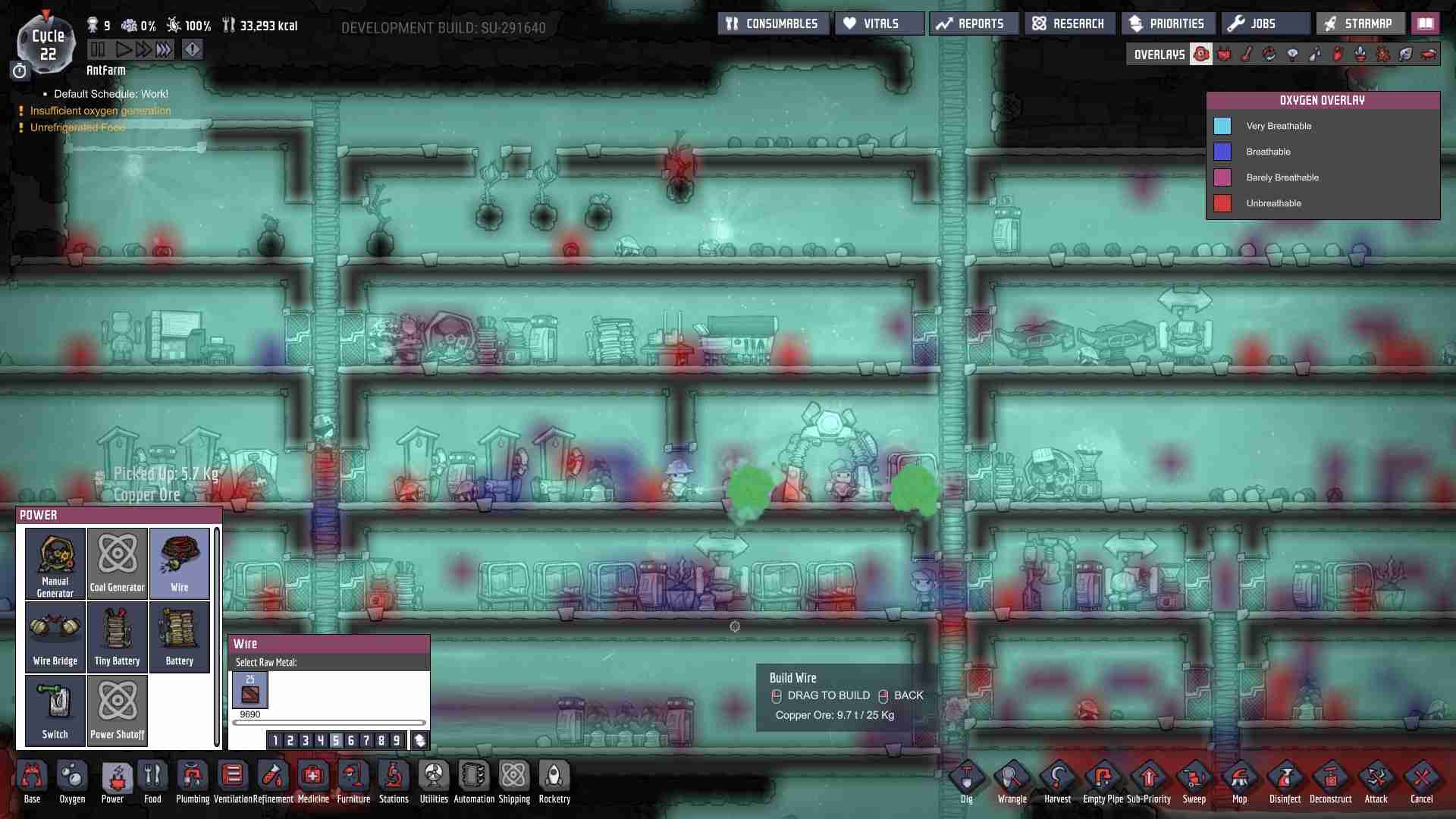 Bon à part ce côté un peu mauvais goût, le jeu reste agréable et au fil du temps ouvre des possibilités et de nouvelles difficultés car plus vous vous éloignez du centre de départ plus les différents éléments qui vous entourent sont dangereux ou nécessitent des traitements spécifiques : poches de gaz toxique, métal dur, slime couverte de germes,… aussi les différentes machines deviennent connectées : gestion du gaz, des eaux usées, de l’électricité. Bref il y’a de quoi passer de nombreuses heures sans problème. Pour l’instant, le seul vrai regret est le manque d’interactions entre duplicants : à part faire « coucou t’es mon meilleur ami » ça reste assez léger pour le moment. Ils ont pourtant tous des compétences négatives en cas de stress trop important mais je n’ai pas encore expérimenté ce côté-là.