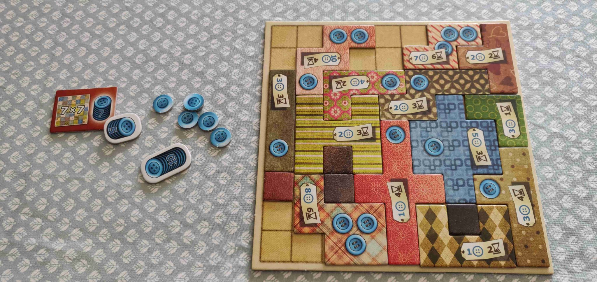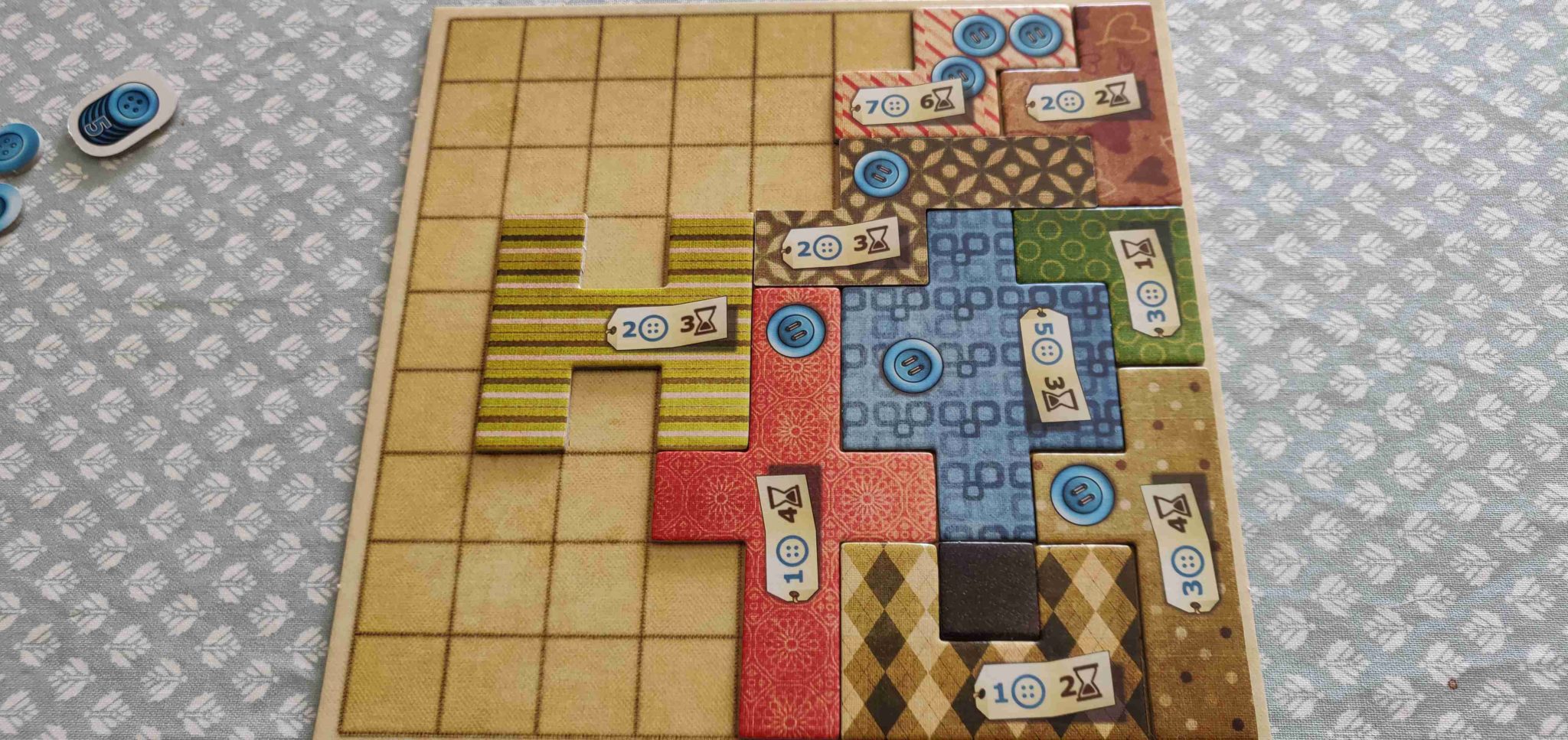 Coudre prend du temps et, de manière logique et à quelques exceptions près, la couture des plus grosses pièces en demande le plus. Pour contrebalancer cela, les pièces de tissu ont aussi un coût en boutons. Ces derniers se gagnent à intervalles réguliers, en passant sur des cases spéciales, et sont les points de victoire du jeu (nous y reviendrons). La valeur des pièces est donc un savant mélange entre valeur en temps et en boutons. Certaines sont très longues à coudre mais ne coûtent que quelques boutons alors que d’autres coûtent extrêmement cher mais ne prendront que quelques unités de temps. Il faut donc constamment jongler entre ses finances (les boutons) et le temps restant (le nombre de cases qui vous séparent de l’arrivée sur la piste centrale).