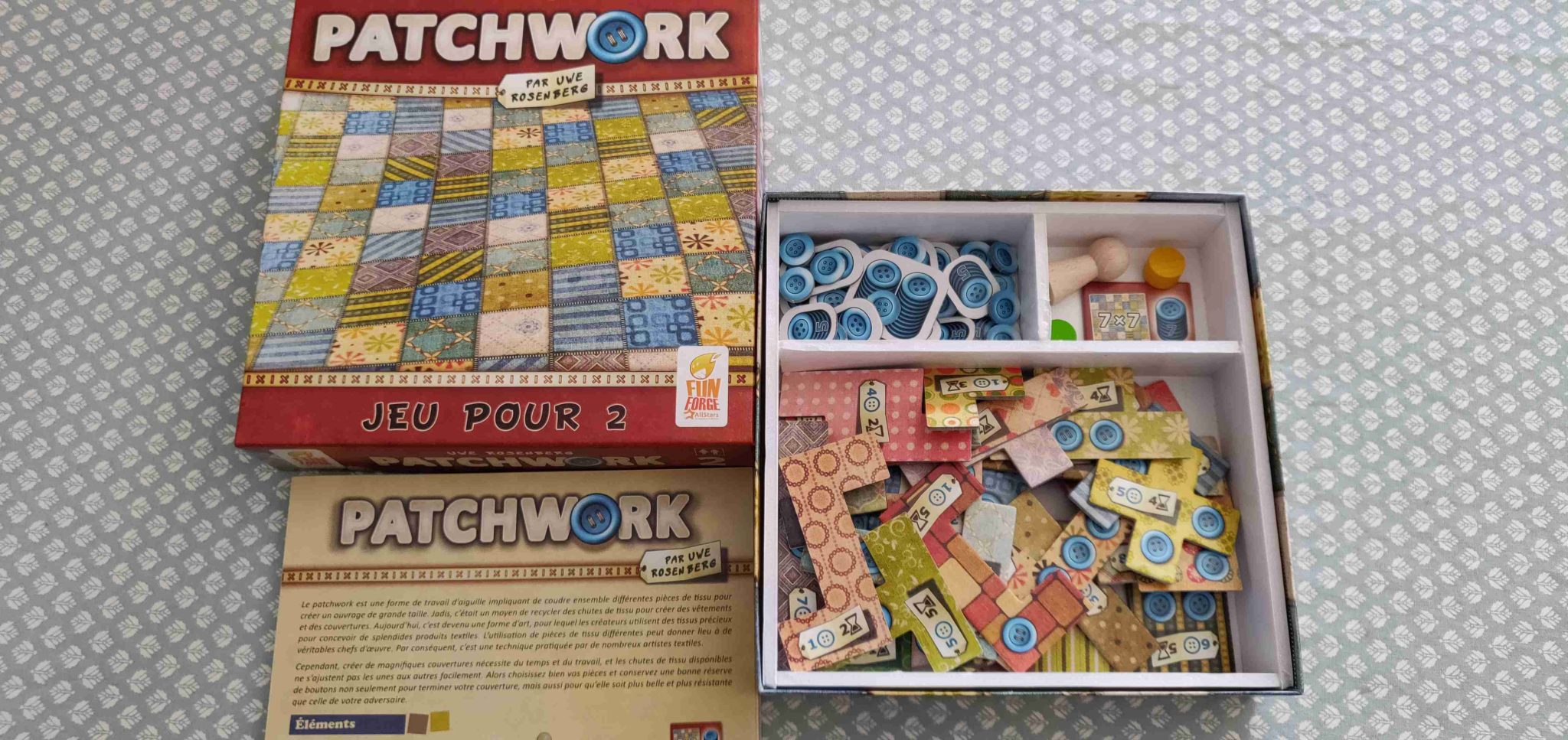 Comme vous commencez à connaître ma femme et son approche particulière en matière de jeux de société, vous vous doutez qu’une partie de Patchwork ne se limite pas pour elle à optimiser chacun de ses tours. C’est même le contraire en fait. Ma femme n’achète que les pièces qui vont bien sur sa couverture. Pas dans le sens « oui il y a la place de la mettre », mais plutôt « les motifs sont bien et collent avec le reste ». Oui, elle prend l’esthétique en compte… Autant vous dire que cette approche particulière ne pardonne pas toujours, mais en cas de victoire, sa belle couverture fièrement tendue devant elle, elle me regarde crânement avec un « tu vois, pas besoin de réfléchir trois tours à l’avance » dans le regard… Et dans ces cas-là, je n’ai qu’une envie : en refaire une autre avec une stratégie différente. Et comme les parties ne durent qu’une demi-heure, que la mise en place est très rapide, autant vous dire que le jeu sort très régulièrement.
