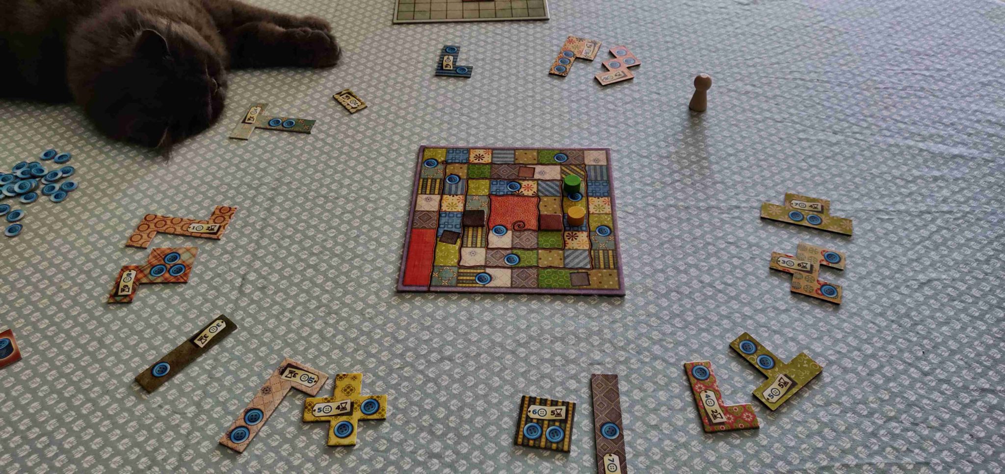 Patchwork est donc un jeu aux mécaniques simples (que je vous explique terriblement mal) et malines. Déterminer quelle pièce rentrera le mieux dans votre patchwork, voir si elle ne coûtera pas trop et si elle rapportera, cela vous demandera pas mal de réflexion car lorsque les joueurs arrivent au bout de la piste centrale, il faudra compter les boutons gagnés et en retrancher deux par espace laissé libre sur la couverture. Une lourde sanction, au point qu’il nous est arrivé à maintes reprises de finir en négatif. C’est un peu humiliant au début mais on s’y fait…