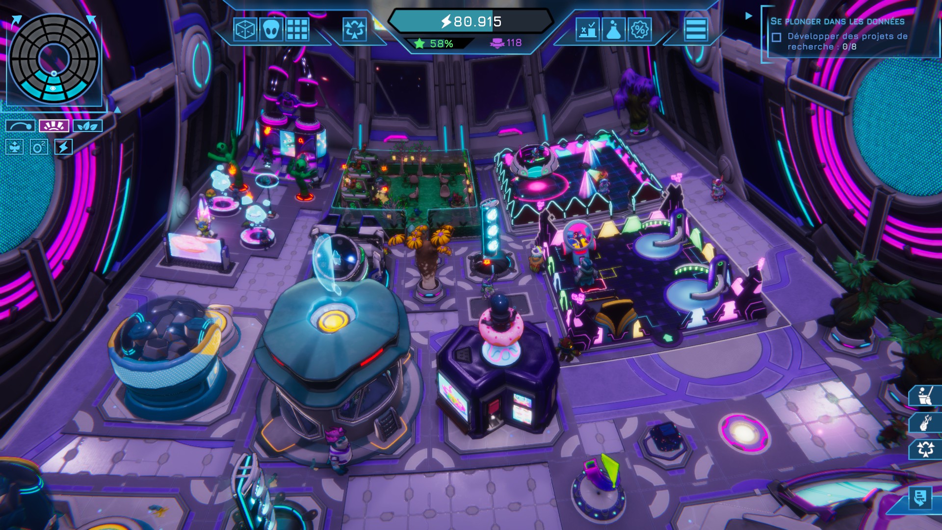 Énergie et satisfaction sont donc les deux indicateurs clés du jeu. La multiplication des attractions touristiques demandera simplement d’agrandir les capacités de production d’énergie. L’enjeu secondaire devient ensuite l’agencement de l’espace, dans les salles tout en longueur de la station. Pour le reste, on surveille les jauges de besoin à la moindre baisse de satisfaction générale, et on ajoute un élément en conséquence… La partie récolte du pont biologique requiert assez peu d’attention, idem pour les phases de combats.