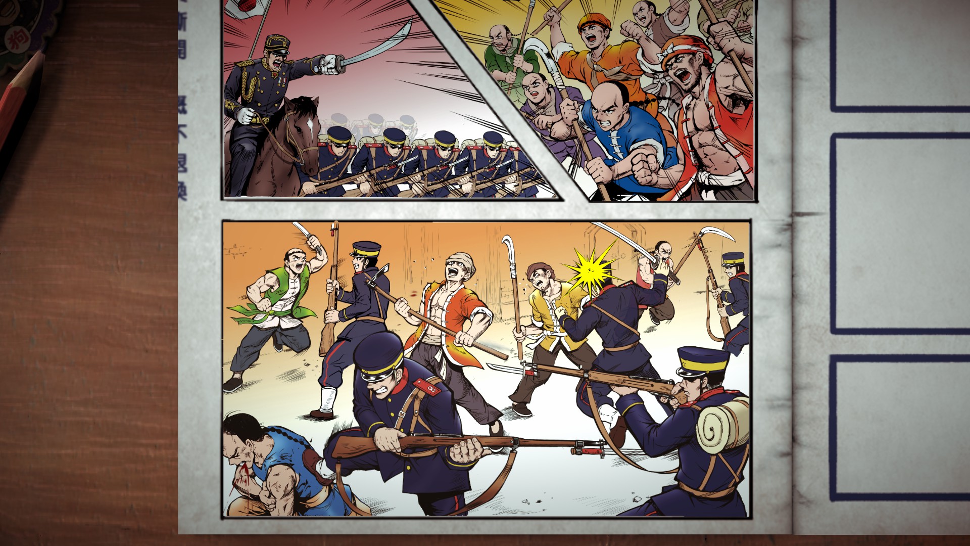 Visuellement et musicalement, le jeu propose une vraie identité assez marquée. Personnellement, j’aime beaucoup et cela permet de proposer un jeu agréable à l’œil sans devoir vendre les organes de sa progéniture pour investir dans une nouvelle CG. On sent que le budget est modeste, mais on s’immerge assez facilement dans la vision (hagiographique) des développeurs de l’histoire de Tiang Ding. La musique est un petit régal pour les oreilles et augmente l’immersion dans l’univers.