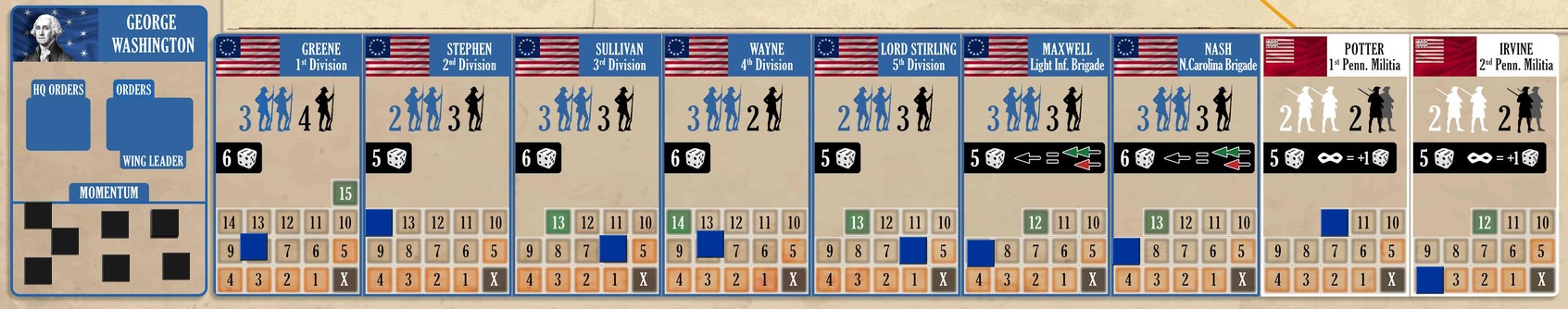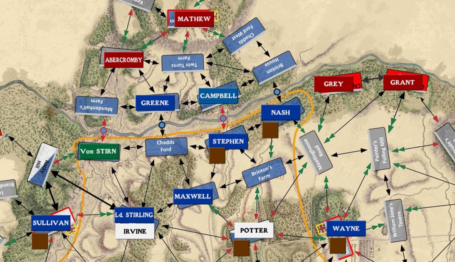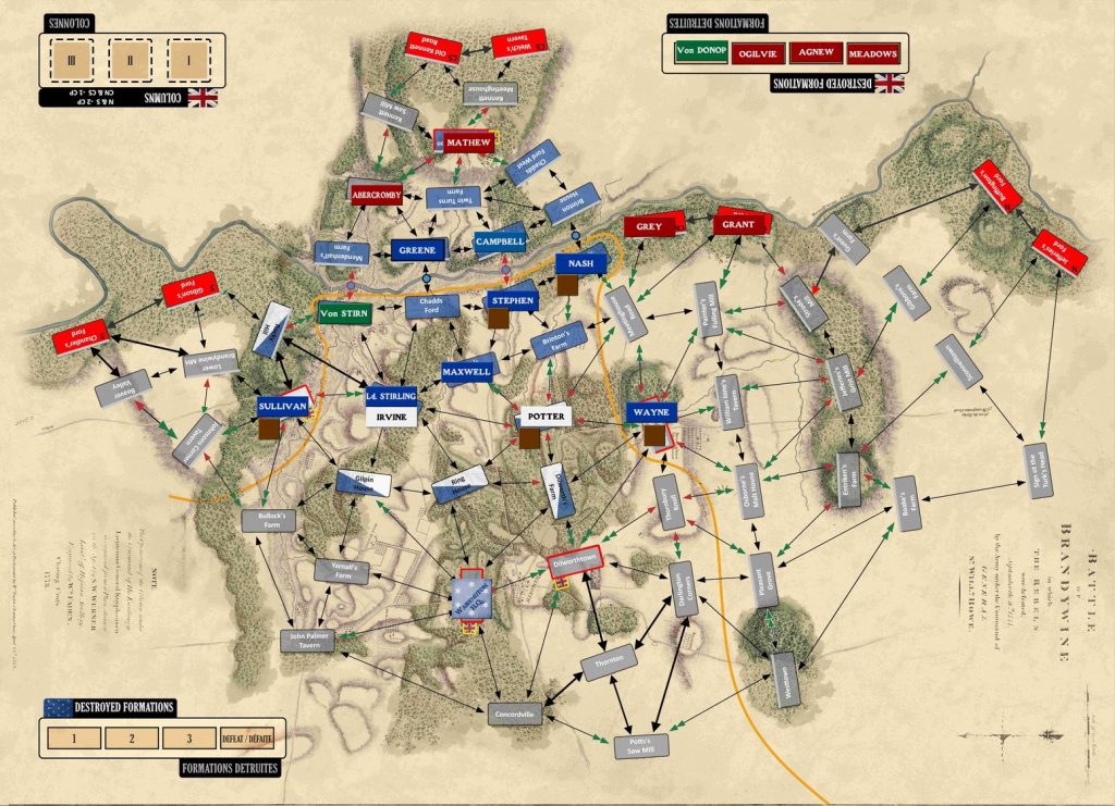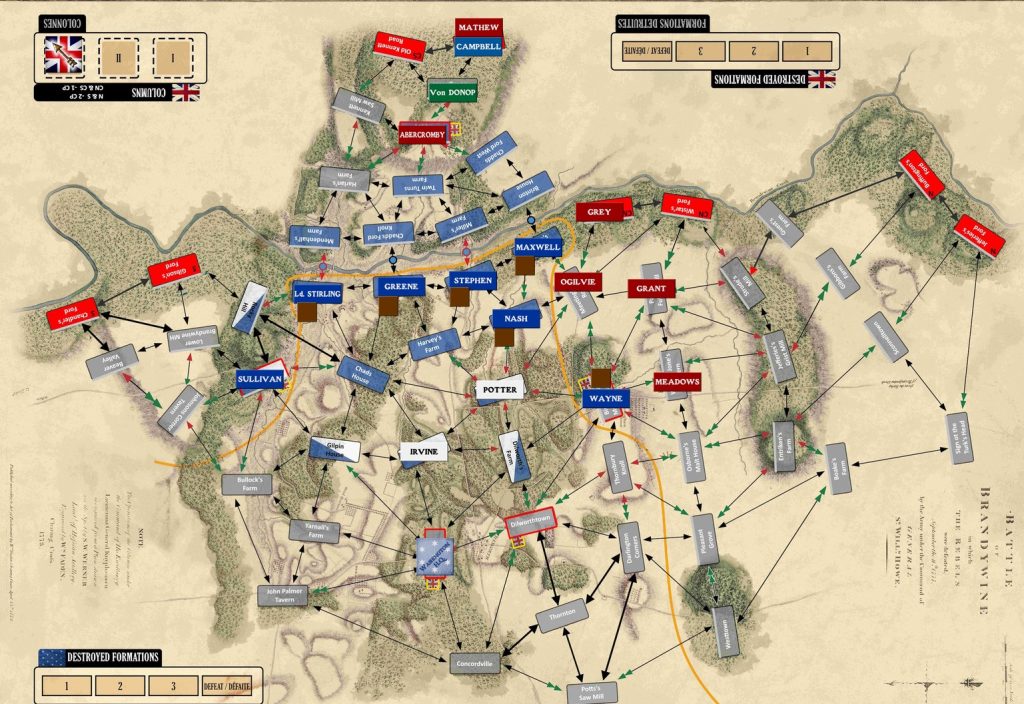 Une fois les troupes américaines placées, les Anglais font jouer leur meilleure expérience tactique avec la création de colonnes. Il n’y en a qu’une par zone d’entrée mais, et c’est là la principale originalité de Brandywine 1777, seul l’Anglais connaît leur composition : de 2 à 10 unités, ou même 0 dans le cas d’un leurre. Oui, l’Américain va donc être dans le flou le plus total au début en voyant de petits drapeaux se promener devant ses troupes.