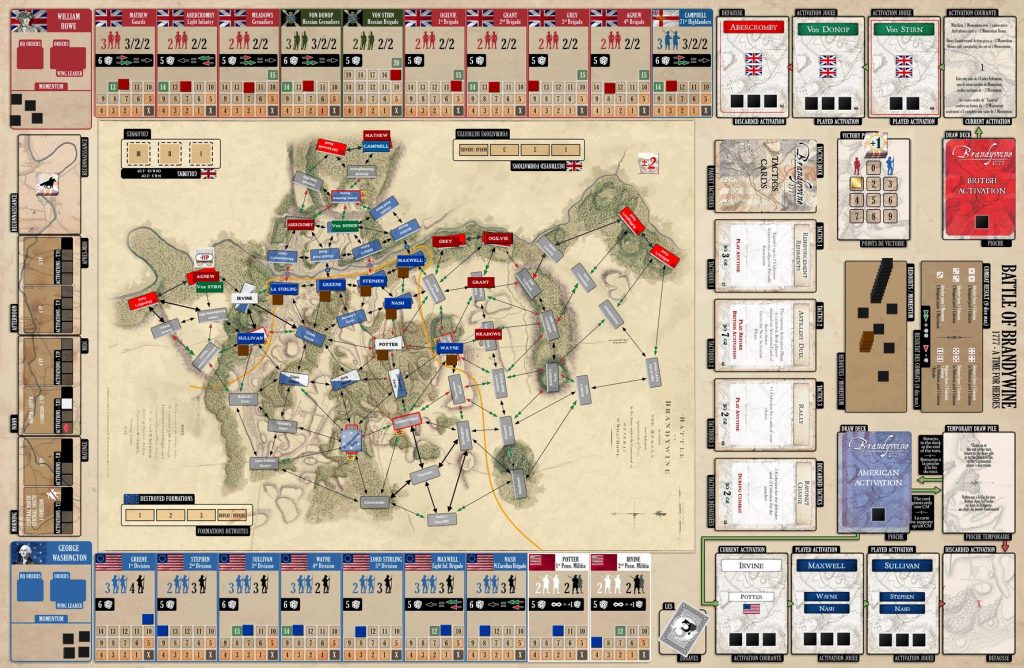 Basé sur le système de Chancellorsville 1863 et approfondi dans Gettysburg a Time for Heroes, Brandywine 1777 est un jeu pour deux joueurs (mais jouable en solo grâce à un bot dédié) se jouant en 2 ou 3h pour les premières parties. Si à l’étude des règles on pourrait s’attendre à une simple attaque défense avec des Anglais très puissants roulant sur des Américains attentistes, on s’aperçoit très vite qu’il n’en est rien. Ou du moins tant que l’Américain ne regarde pas son adversaire jouer.