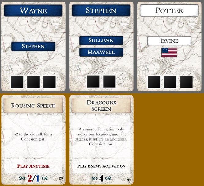 Un nom apparaît en gros et en haut : cette formation bénéficiera d’une activation majeure et pourra avancer de deux emplacements ou avancer à nouveau après un combat. Les autres auront une activation mineure, c’est-à-dire une seule action. Chaque carte ayant une combinaison unique de noms (qui peuvent être remplacés par des drapeaux, indiquant que le joueur active la formation de son choix), il faut vraiment bien réfléchir avant de les jouer pour en tirer le bénéfice maximum.