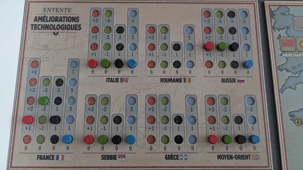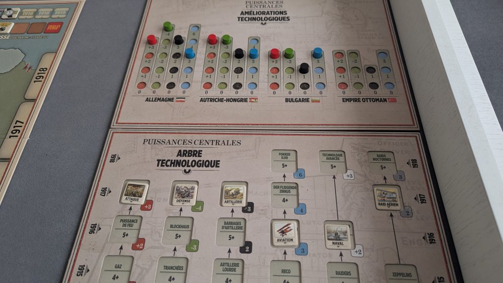 Ensuite, les joueurs vont tenter de débloquer de nouvelles technologies : attaque, défense, artillerie, aviation, naval et raid aérien sur un arbre technologique commun à toutes les nations d’un camp. Ce déblocage se fait en investissant un PR pour tenter de faire autant ou plus qu’un chiffre, inscrit en dur sur le plateau, sur un jet de dé.