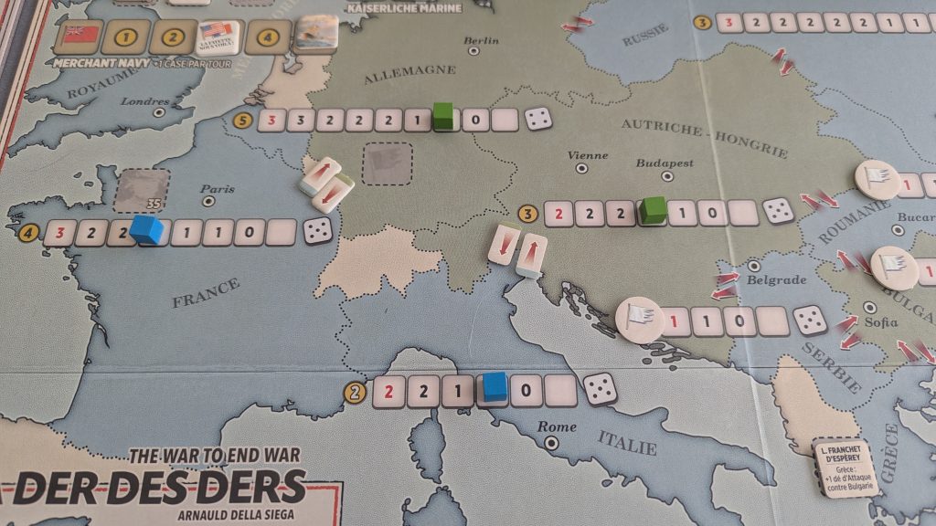 Une fois que chaque joueur a fini ses investissements, place aux choses sérieuses et aux offensives. Chaque secteur, si vous regardez la carte, dispose d’une piste de rupture et d’indicateurs d’axes d’offensive. Par exemple, la Russie ne peut attaquer et être attaquée que par l’Allemagne, l’Autriche-Hongrie et l’Empire Ottoman.