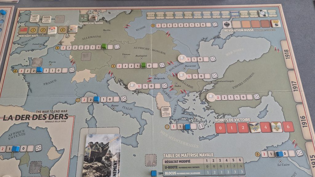 Méfiance donc… Une fois chaque secteur activé, ou si les joueurs ont passé faute de PR suffisants, on avance le marqueur de la marine marchande de l’Entente et on passe au tour suivant.