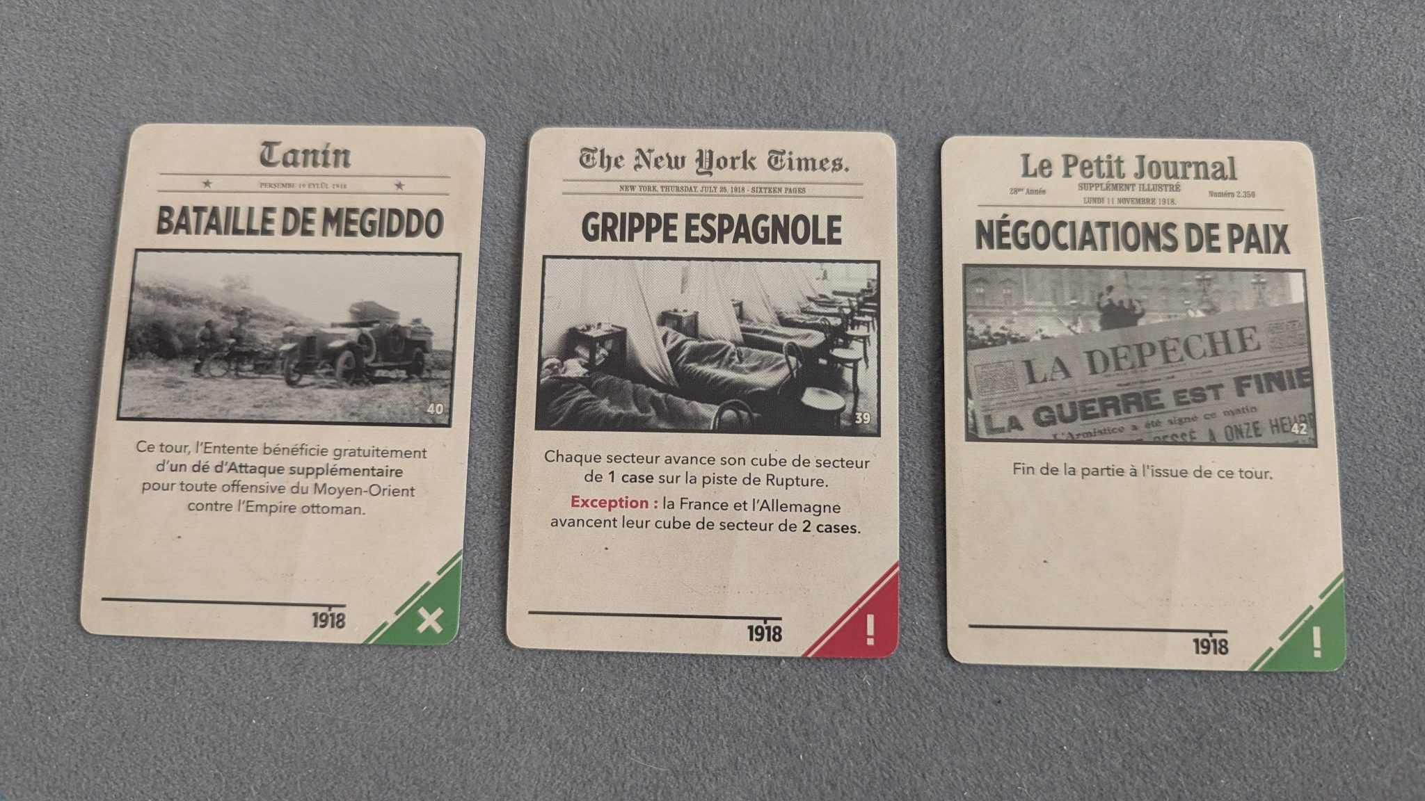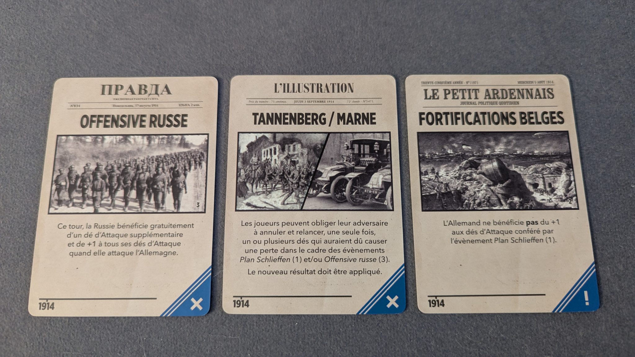 La séquence de jeu est très simple et divisée en 7 étapes. Après avoir déterminé l’initiative, les joueurs tirent 3 événements d’un deck dédié à l’année en cours et résolvent les effets. Ils vont de l’annonce de l’entrée en guerre d’un pays à l’obligation de réaliser une des offensives majeures de la Première Guerre, en passant par divers bonus et malus pour certaines nations. Ces événements sont obligatoirement résolus et seul le joueur des Puissances Centrales peut se débarrasser de certains s’il a débloqué la technologie adéquate.