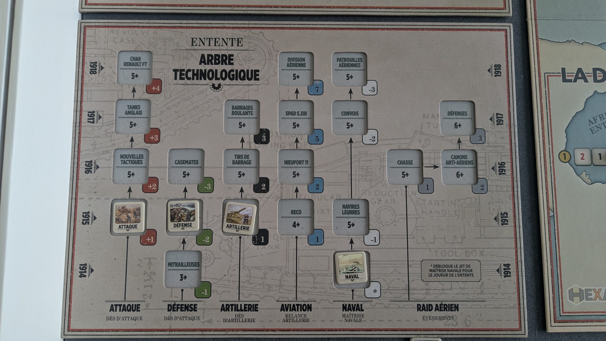 Ensuite, les joueurs vont tenter de débloquer de nouvelles technologies : attaque, défense, artillerie, aviation, naval et raid aérien sur un arbre technologique commun à toutes les nations d’un camp. Ce déblocage se fait en investissant un PR pour tenter de faire autant ou plus qu’un chiffre, inscrit en dur sur le plateau, sur un jet de dé.