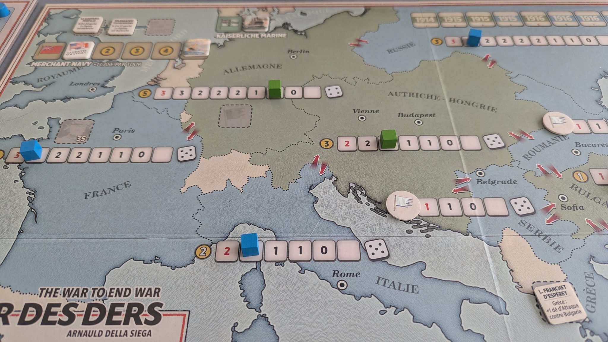 Une fois que chaque joueur a fini ses investissements, place aux choses sérieuses et aux offensives. Chaque secteur, si vous regardez la carte, dispose d’une piste de rupture et d’indicateurs d’axes d’offensive. Par exemple, la Russie ne peut attaquer et être attaquée que par l’Allemagne, l’Autriche-Hongrie et l’Empire Ottoman.