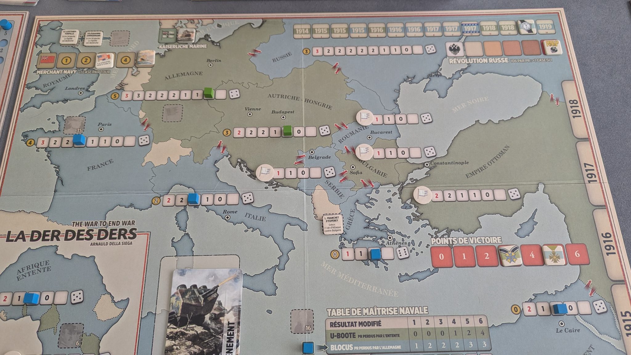 La Der des Ders: The War to end War de son nom complet, est un jeu stratégique sur la Première Guerre Mondiale mettant en scène l’Entente et les Puissances Centrales – avec en plus les colonies africaines – sur lequel deux joueurs peuvent s’affronter mais qui accepte aussi le jeu en solitaire via l’utilisation d’un bot, Athena, très bien fichu qui peut incarner le camp délaissé par le joueur grâce à un deck de cartes dédié.