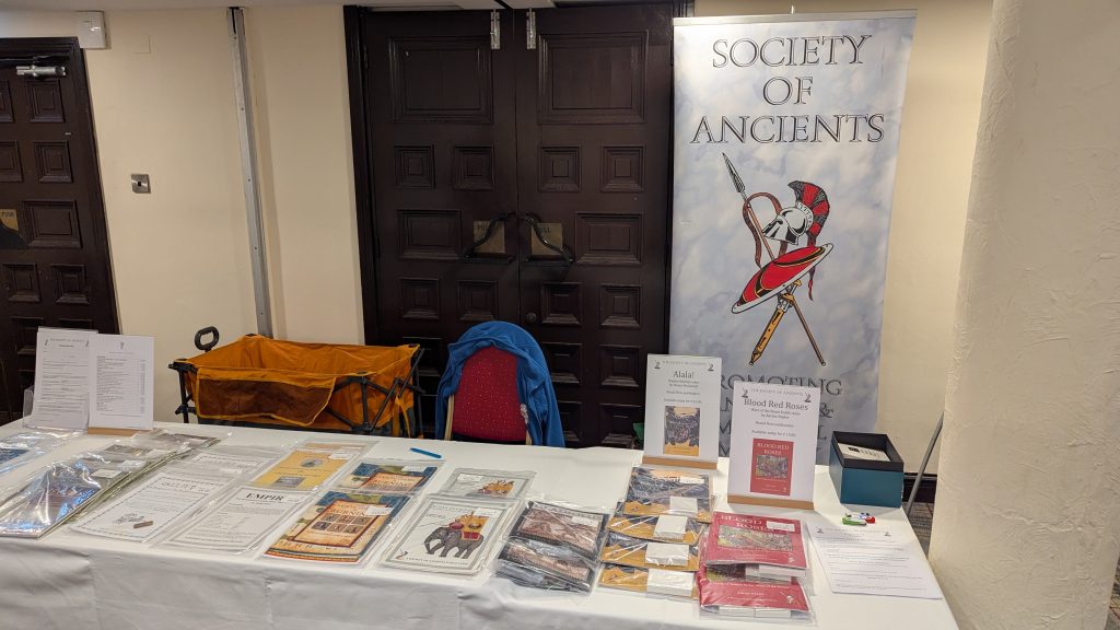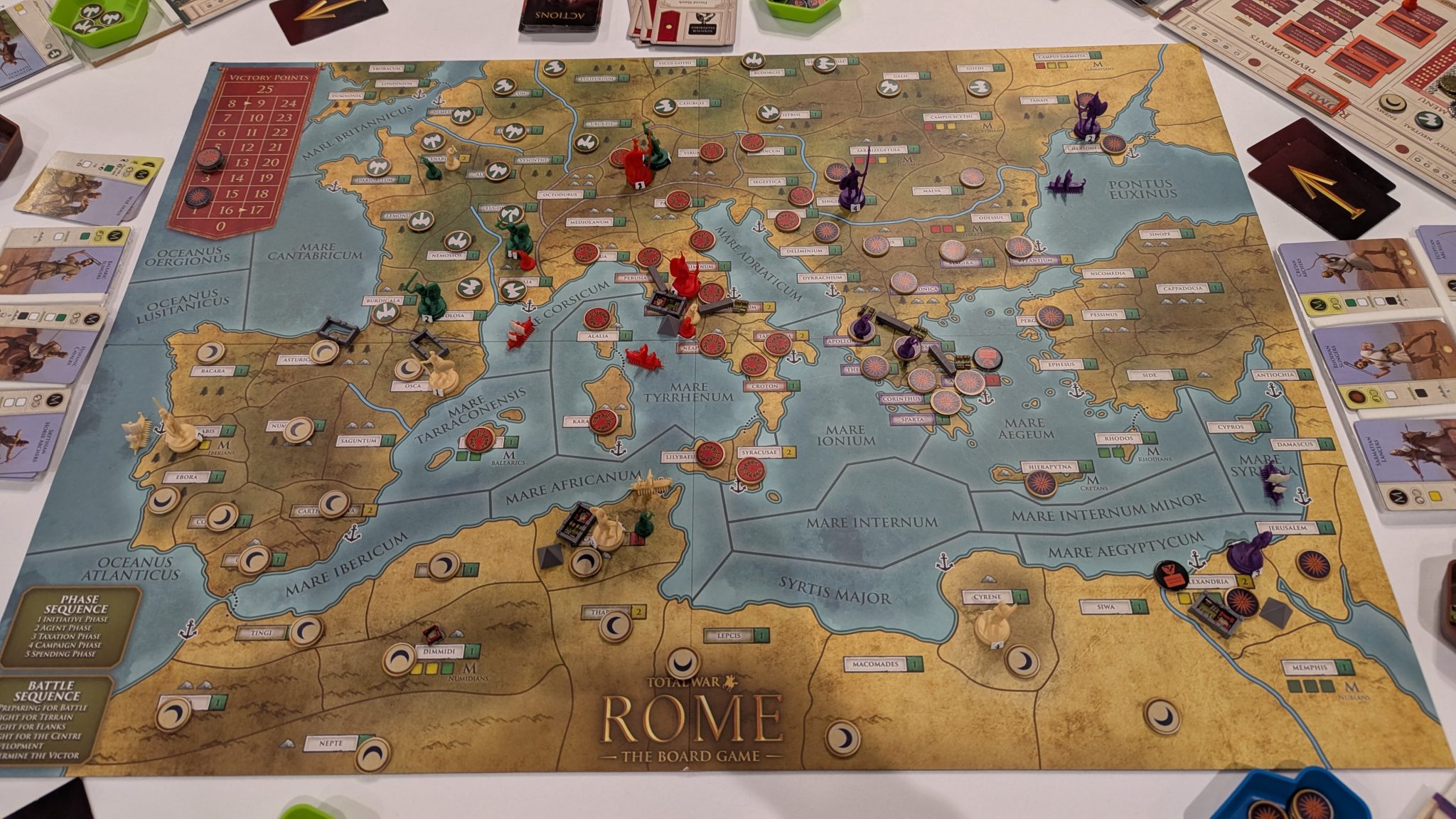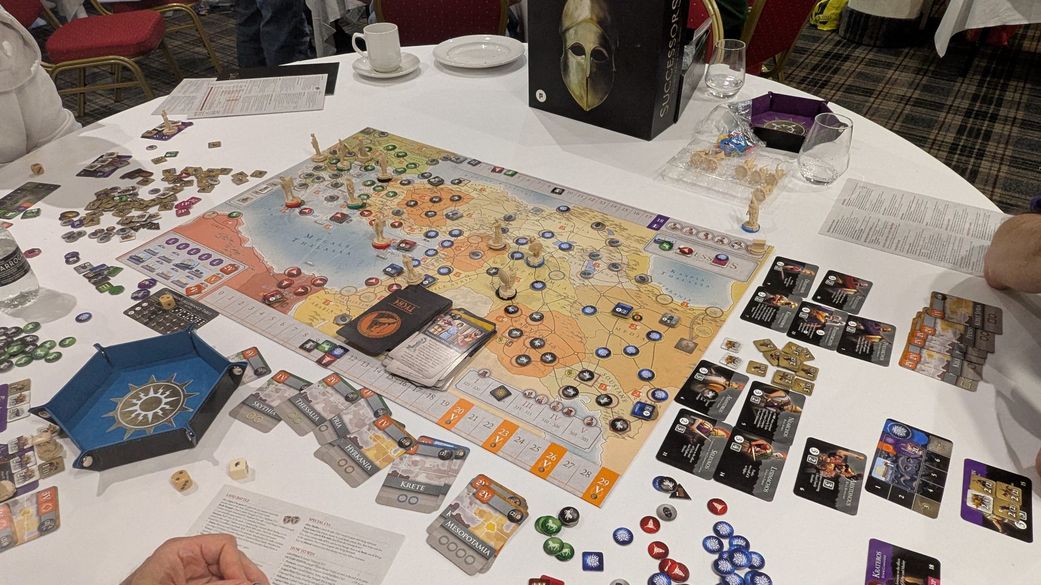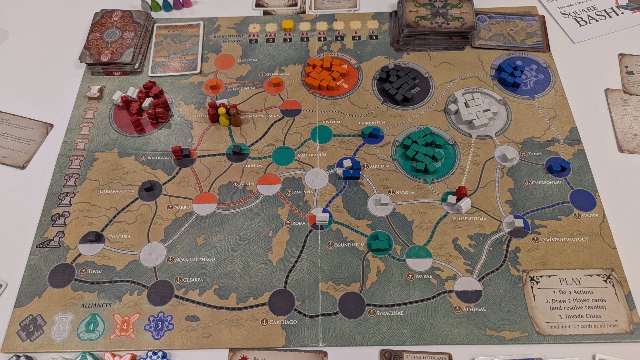 Le tour du propriétaire fait en arrivant le jeudi, direction la chambre pour une bonne nuit de sommeil avant d’attaquer les choses sérieuses le vendredi. En ce qui me concerne, j’ai démarré tranquillement en faisant une partie de Pandemic: Fall of Rome avec Richard Jeffrey-Cooke de la Society of Ancients, une association très dynamique éditant des jeux (je leur ai d’ailleurs pris Gladiolus, dont je vous parlerai sûrement un jour) et un magazine, Slingshot. Un jeu sympathique qui m’a mis dans l’ambiance avant une partie de Rome: Total War à quatre joueurs, toujours sous la direction de Richard.