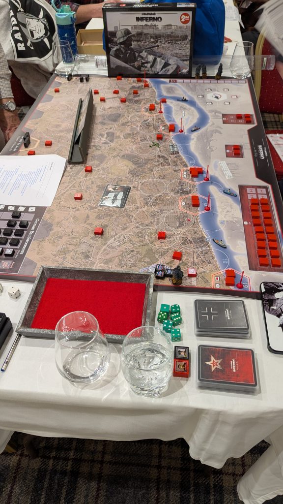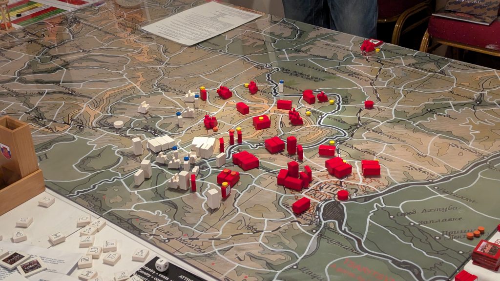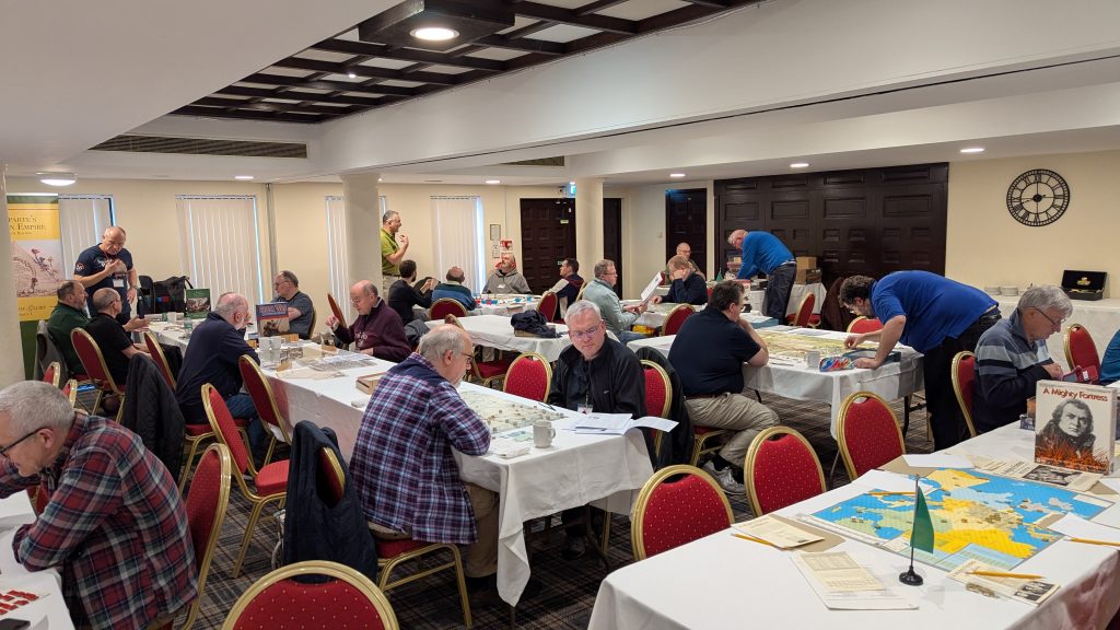 Le week-end est donc passé à toute vitesse, rempli du début à la fin de parties, de discussions plus ou moins sérieuses, de débriefings autour d’un verre. Si j’ai beaucoup joué, j’ai surtout beaucoup discuté, car c’est bien l’essentiel de ces rassemblements. Si j’ai vu tourner les jeux habituels des conventions – Angola, Successors, A Most Fearful Sacrifice, Normandy ’44… – j’ai aussi été ravi de voir des titres bien moins joués. Il y avait même du Coalitions et une partie de scrabble en cours où n’importe qui pouvait venir jouer contre Caroline Rourke. Original et très convivial !