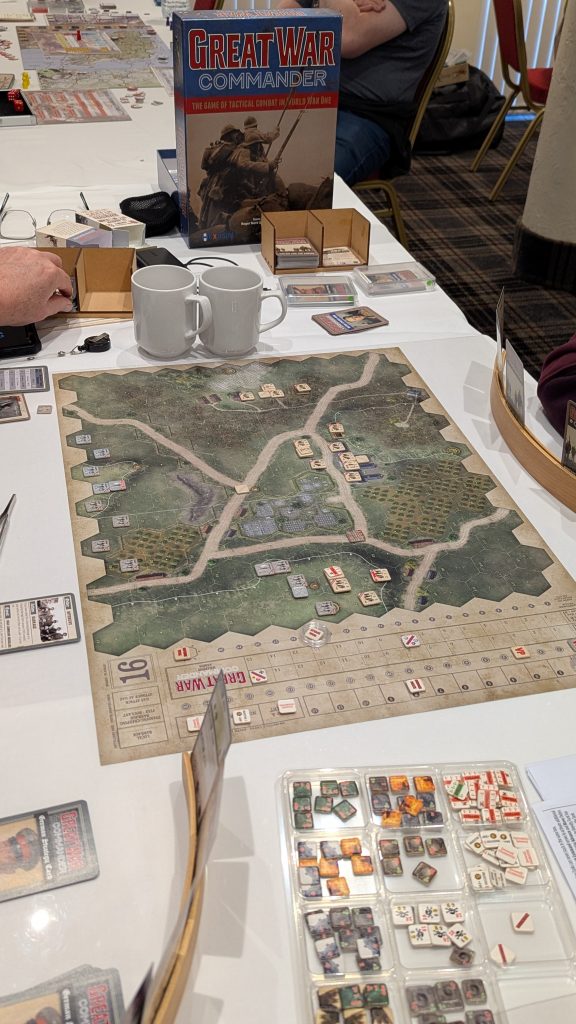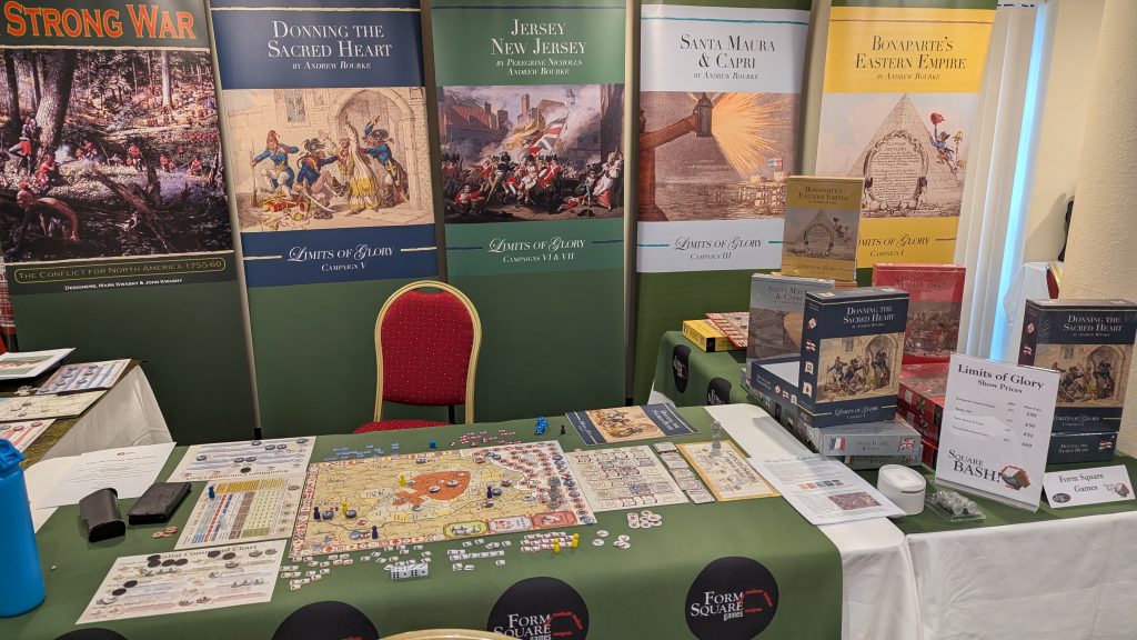 Autour de moi les batailles faisaient rage, que ce soit sur des jeux accessibles, comme Undaunted ou de plus gros morceaux. Il y avait même une gigantesque table réservée à Company of Heroes, dont le matériel est vraiment superbe mais que je n’ai malheureusement pas pu essayer. Au stand Form Square Games, les parties s’enchaînaient sur Donning the Sacred Heart – qui est en cours de livraison après une campagne Gamefound réussie – et Jersey New Jersey et les auteurs semblaient aux anges. Il faut dire que les retours étaient très positifs, ce qui démontre que le système Limits of Glory n’est pas cantonné au Napoléonien.