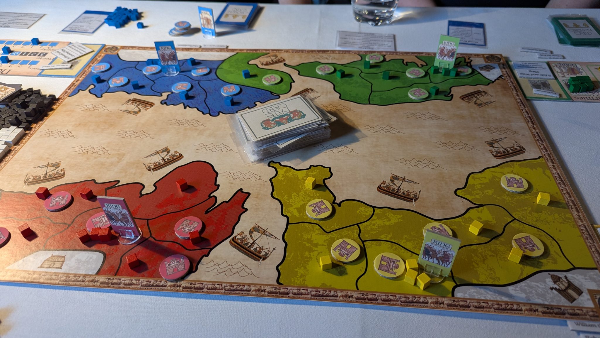 En autre prototype qui m’a tapé dans l’œil, il y a Heirs of Canute, un warteau pour quatre joueurs dans lequel chacun dirige un royaume (normand, danois, anglais ou norvégien) à la mort de Canute au XIème siècle. Les règles sont simples, avec un système d’actions politiques ou militaires où trahisons et attaques opportunistes auront la part belle.