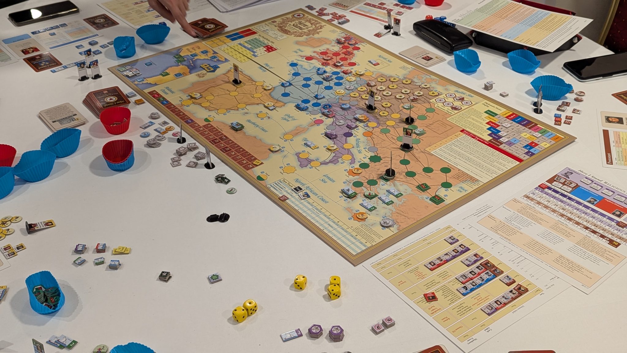 Lors de notre partie de dimanche après un début timide puis une exploitation des événements s’acharnant sur Steve – puisses-tu me pardonner de tout ce que je t’ai infligé – qui a vu ma puissance militaire exploser, j’ai subi les assauts dévastateurs des frères Hunwicke qui s’étaient ligués contre moi. Le jeu est brutal, il faut planifier soigneusement sa stratégie et surtout être prêt à réagir aux événements aléatoires piochés à chaque tour. Un autre jeu à surveiller et qui sera sûrement édité lui aussi chez Form Square Games.