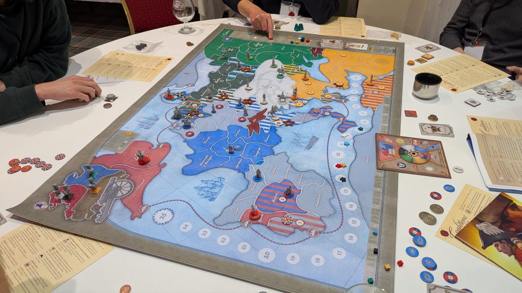 Il y avait de nombreux autres prototypes à découvrir, comme Wolfe Tone’s Rebellion (basé sur le système Limits of Glory) et nombreux étaient les joueurs à venir jeter un œil, histoire d’avoir une présentation même succincte, ou même se lancer dans une partie découverte. C’est d’ailleurs quelque chose qui m’a surpris par rapport à la PunchedCon : les gens semblaient plus mobiles et moins happés dans leurs parties. Peut-être était-ce dû au fait qu’il y avait plus de parties de jeux de société, comme Nemesis, Arcs, Eclipse (…) qui sont plus courts, ou peut-être n’était-ce qu’une impression.
