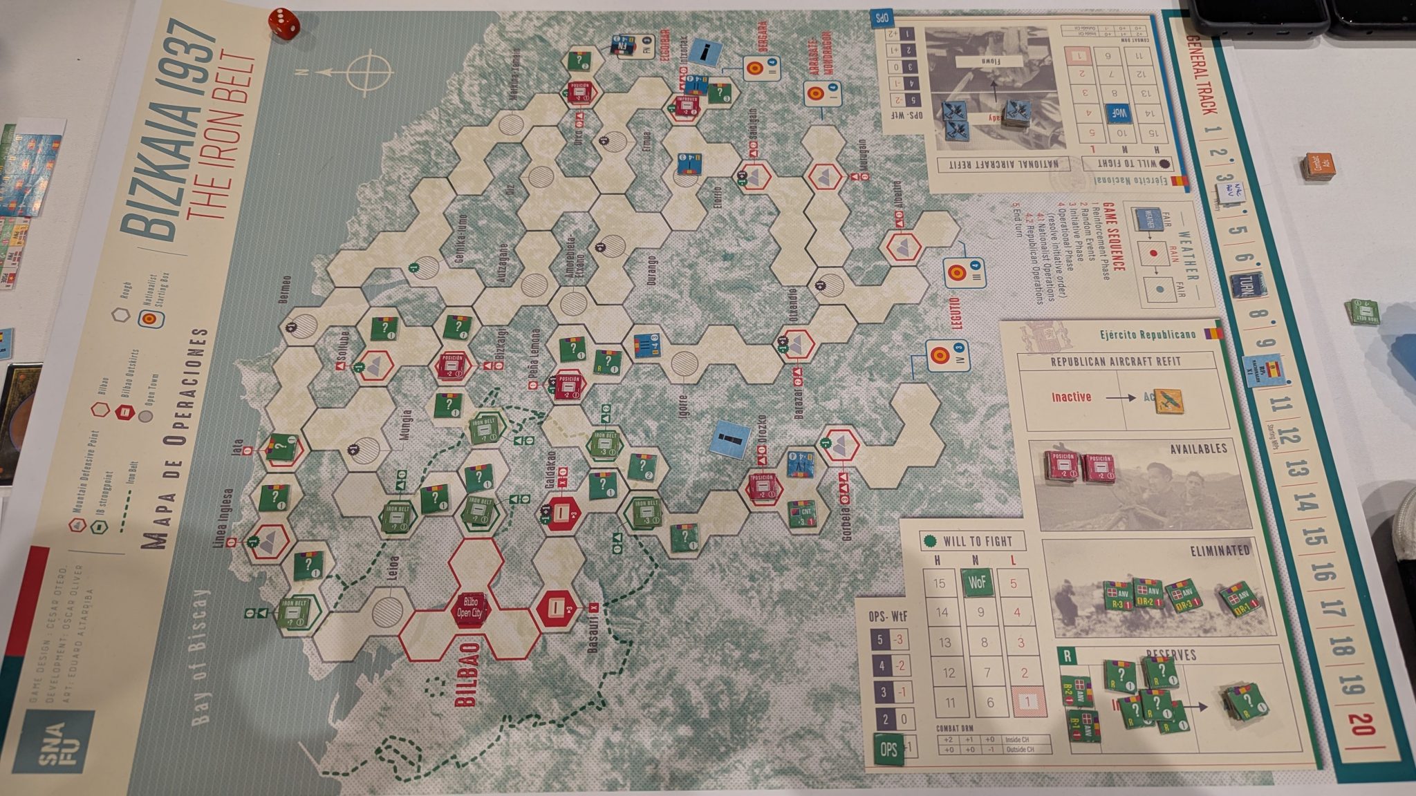 Quoi qu’il en soit, cette SquareBASH 26 était vivante à n’en pas douter, notamment grâce à la présence notable (et notée !) d’une délégation de Catalans (et j’insiste bien sur le Catalan et non pas Espagnol, hein Ivan !) du club Team Snafu, que vous connaissez sûrement par la maison d’édition SNAFU Design. Menée par Oscar Oliver et Ivan Prat, la délégation a animé – entre autres – une partie d’Here I Stand et le repas du samedi soir en partageant de nombreuses anecdotes sur l’histoire de leur région. J’ai même eu l’opportunité d’essayer un de leurs jeux à venir, The Iron Belt: Bizkaia 1937. Je suis reparti avec Equatorial Clash et Tarqui, dont je ne manquerai pas de vous parler, promis.