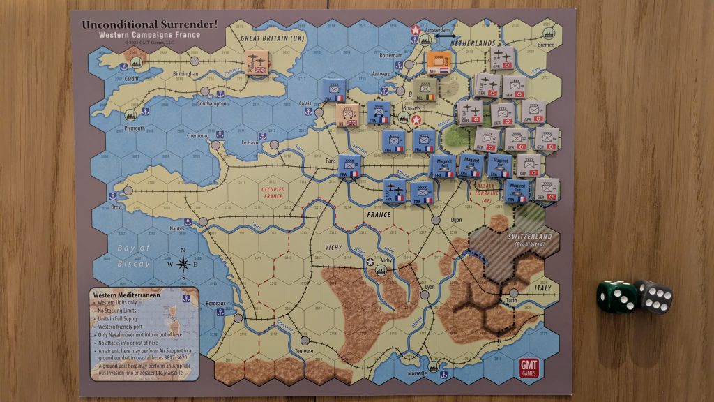 Le pari est donc simple : isoler un conflit et diminuer le nombre de pions pour obtenir un titre dense et stratégique tout en réduisant drastiquement le temps de mise en place et de jeu. On pourrait se lancer une partie un soir de semaine, emporter le jeu partout avec soi et même initier des joueurs intimidés par l’expérience complète. Unconditional Surrender! Western Campaigns propose de ce fait 9 scénarios, de l’invasion de la Pologne à la campagne d’Afrique du Nord en passant par la France en 41 puis en 44.