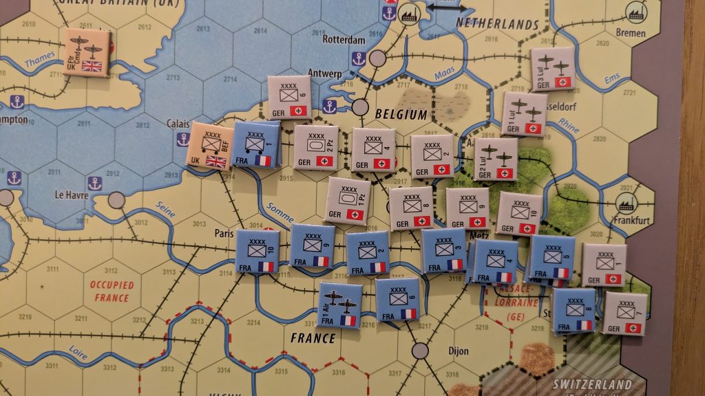 Pour finir, le format poche rend la lecture et les manipulations difficiles. Les hexagones peinent à contenir leur pion, qui cache les informations clés (type de terrain, ville industrielle…) et nécessite d’être soulevé. La pince à épiler est plus que jamais de rigueur, notamment pour les scénarios denses comme la France. Sans elle, la ligne Maginot s’écroulera, mais à cause de vos doigts. En ce qui concerne la qualité de production, on se situe dans l’entrée de gamme de GMT. Des cartes en papier fin et des pions en carton simple, façon jeu Vae Victis. Mais à 35€ la boîte, c’est compréhensible.