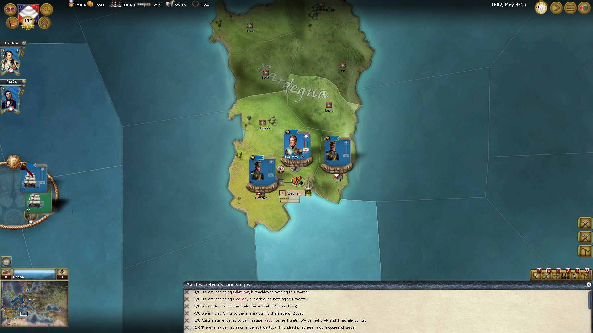 Au niveau du moteur on a donc une interface lisible mais vieillissante et peu réactive, des performances catastrophiques pour afficher une map et un calcul de tours (certes il y a l’IA à calculer, ce qui pour des wargames prend toujours beaucoup de travail processeur) interminable. Et quand je dis interminable c’est vraiment le cas, c’est le premier jeu qui me fait regretter de n’avoir qu’un seul écran. 7 minutes de calcul par tour ! Sachant qu’un tour calcule une semaine et qu’il faut à peu près 250 jours pour construire un navire… voilà le problème principal du jeu. Car en plus il y’a quelques soucis de stabilité qui fait que le jeu plante en cas d’alt tab intempestifs et parfois lors de long AFKs. Bref laisser le jeu tourner et faire deux trois actions et cliquer sur tour suivant n’est pas toujours une option viable. Et c’est bien dommage car comme dit plus haut, les jeux du genre sont rares et les jeux de qualité encore plus. Car des qualités il en a, un OOB (Order of Battle) bien rempli, une carte superbe (même si je regrette la non utilisation des noms et découpages des cartes impériales de l’époque…Koblenz pour Mayence, Antwerpen pour Anvers), des cartes de figurines agréables à regarder, des options tactiques intéressantes… on a envie d’y jouer mais on a parfois l’impression que le jeu demande trop d’investissement pour ce qu’il nous donne. 3 minutes de jeu toutes les 10 minutes ce n’est pas vraiment acceptable.